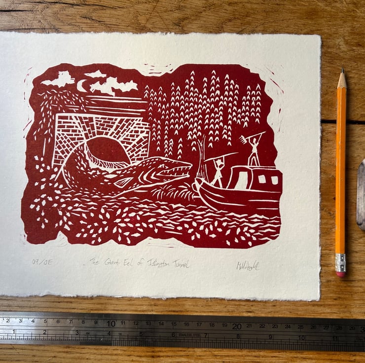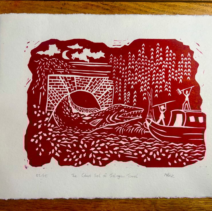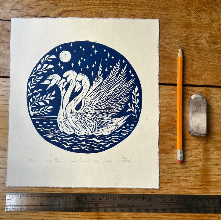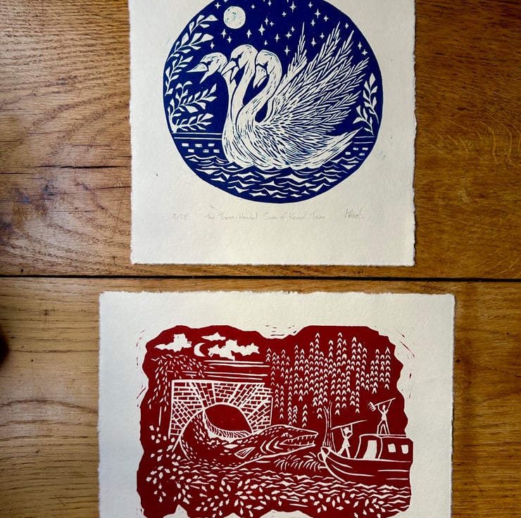 These linoleum prints are part of my series mythical creatures of the London canals . So far I have made 'The Giant Eel of Islington Tunnel' ( in dark red) and 'The Three-Headed Swan of Kensal Town' ( in dark blue ). Every print is handmade and therefore unique. Colours, textures and size might vary slightly but should be relatively close to what is seen in the picture. These prints are an open edition. I have included the print number on the bottom left corner. These designs are under copyright for myself Maike Hitzeroth. The purchase of a print does not transfer the copyright to the buyer.