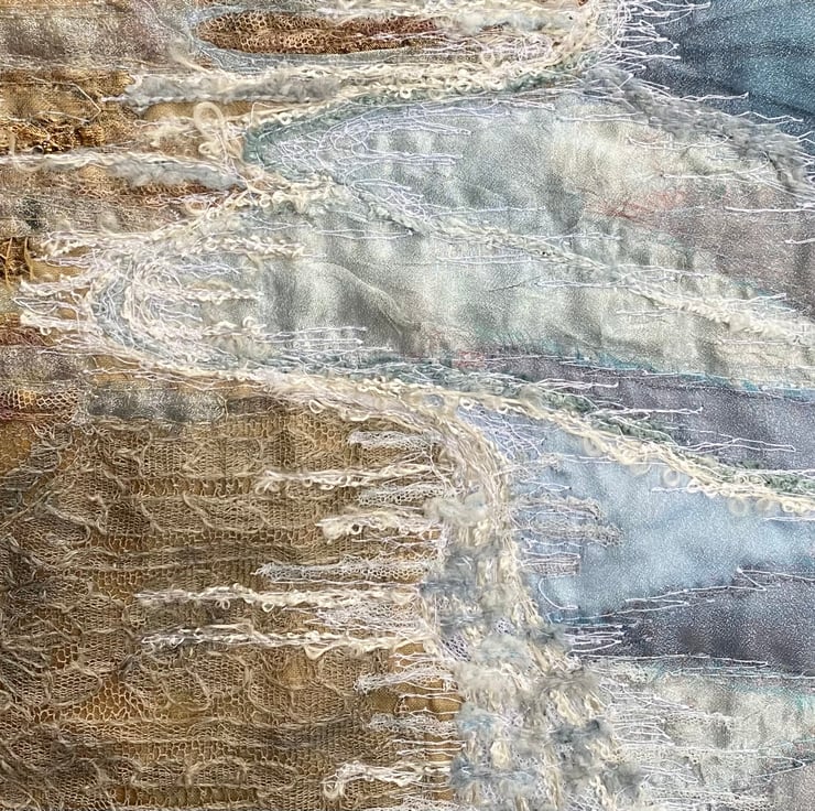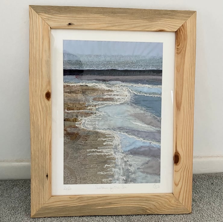 This original Artwork shows the beach at Saltburn-by-the-Sea looking from the beach. It's made from up-cycled fabric, with free motion embroidery.