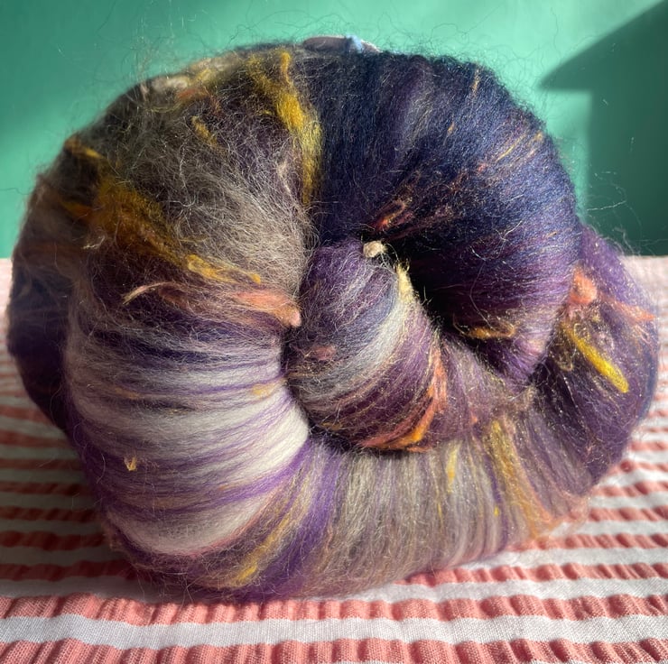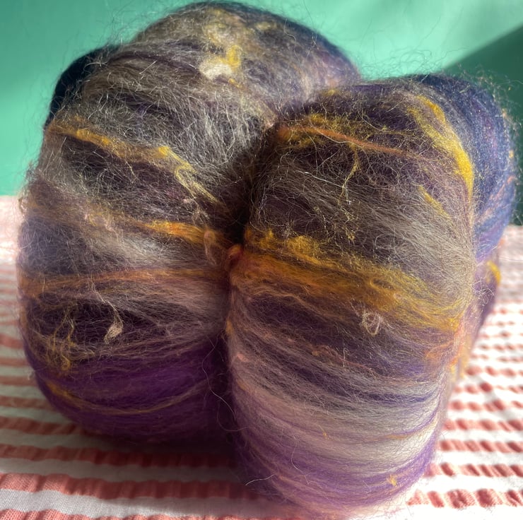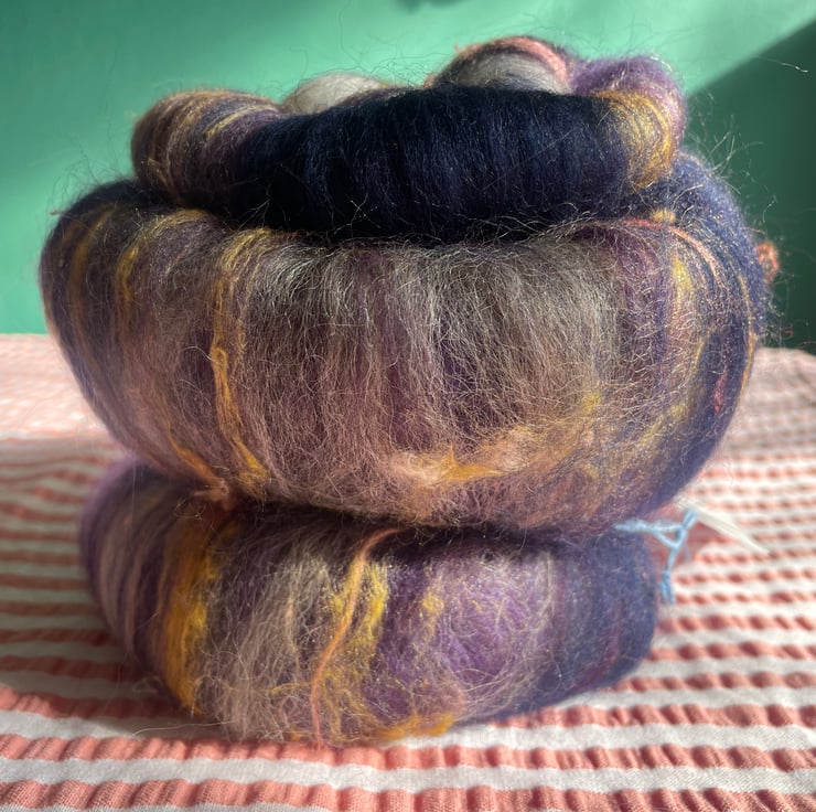 These batts have multiple layers within them and will reveal their secrets as you spin, don't be surprised to find more colour & texture underneath the top layer!!