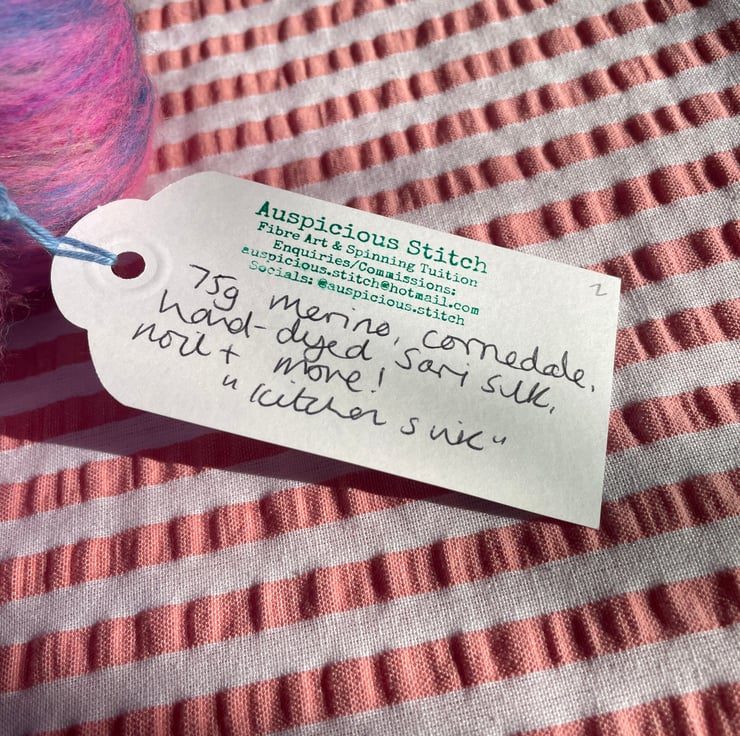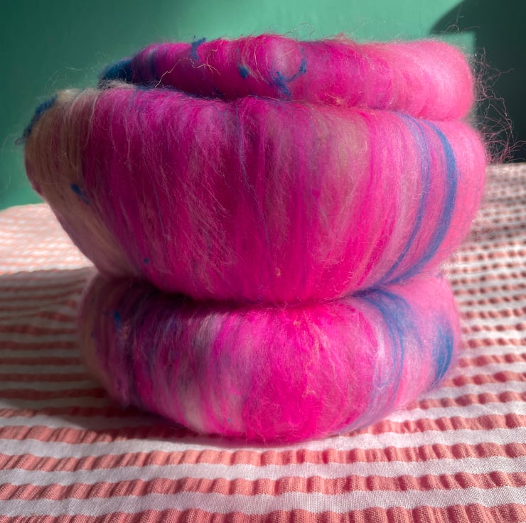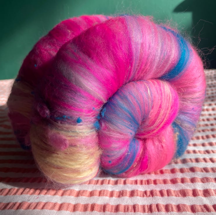 These batts have multiple layers within them and will reveal their secrets as you spin, don't be surprised to find more colour & texture underneath the top layer!!