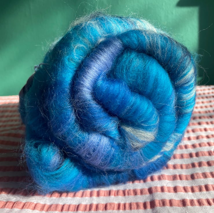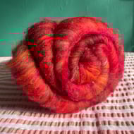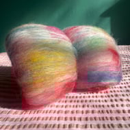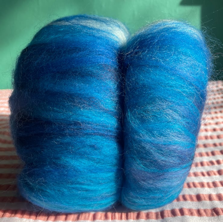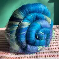 These batts have multiple layers within them and will reveal their secrets as you spin, don't be surprised to find more colour & texture underneath the top layer!!