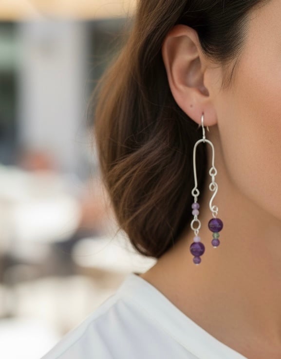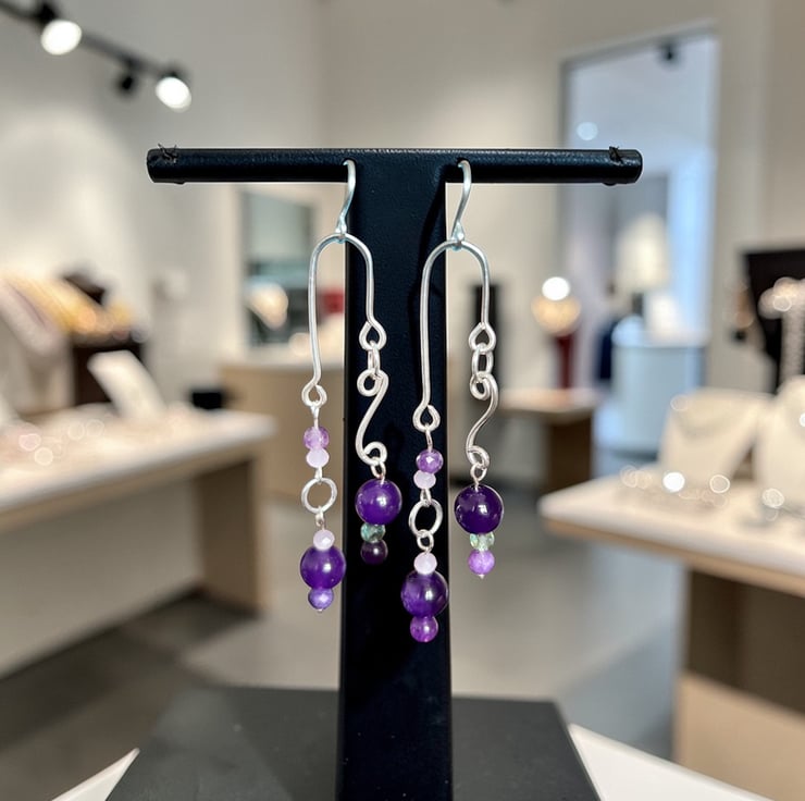 I have used 925 Sterling Silver 1mm gauge jewellery wire featuring semi precious stones with an earring drop of 2.5 inches. The beautiful faceted semi precious stones are a mix of Amethyst, Rose Quartz and Peridot to complement my design. These earrings are very eye catching and a great addition to any jewellery collection.