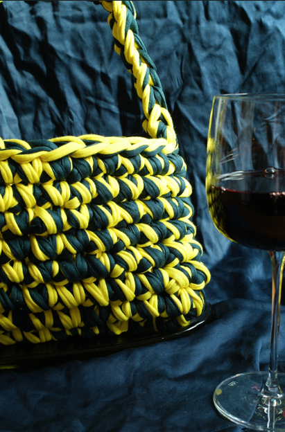 Recycled t-shirt yarn crocheted bag in midnight blue and lemon.