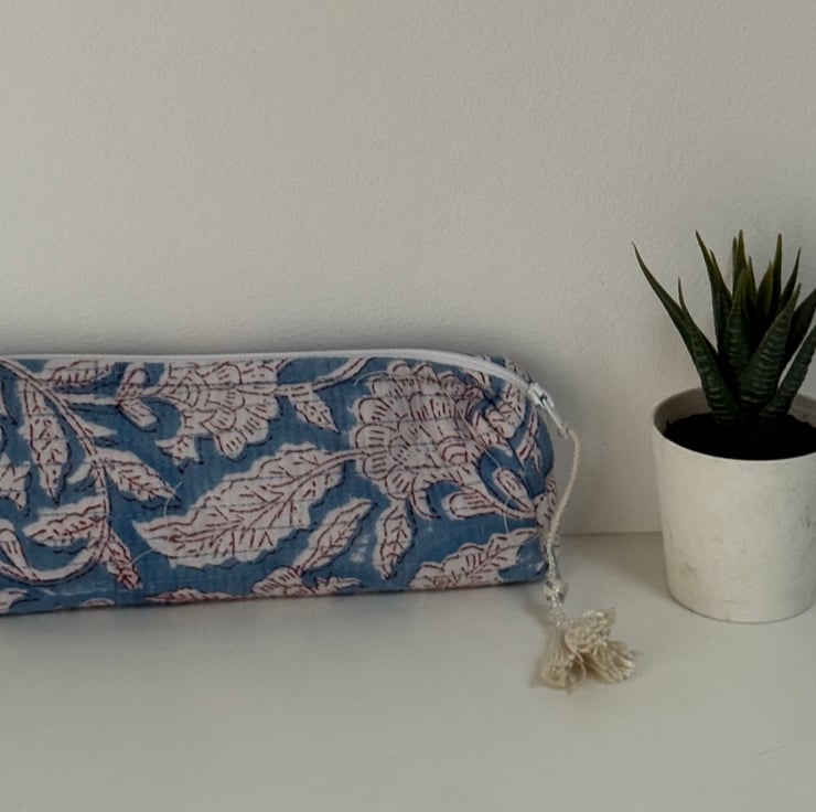 Handmade quilted cotton pencil case or sleek makeup bag with a vibrant floral print.
