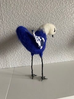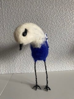 Meet Gretta the WAFFA Bird – This colourful little bird is a Wild and free fibre art bird. Needlefelted on a wire frame with a white head and bright blue body and brown legs and feet, She Stands approximately 19cm to the top of her head with colourful wings made from cotton fabric attached with a button so they can be adjusted. With black bead eyes and brown beak. As she is made on a wire frame, her head can be adjusted to look to the side should she sees something of interest. She does look a bit like a seagull, so keep an eye on your ice creams!
