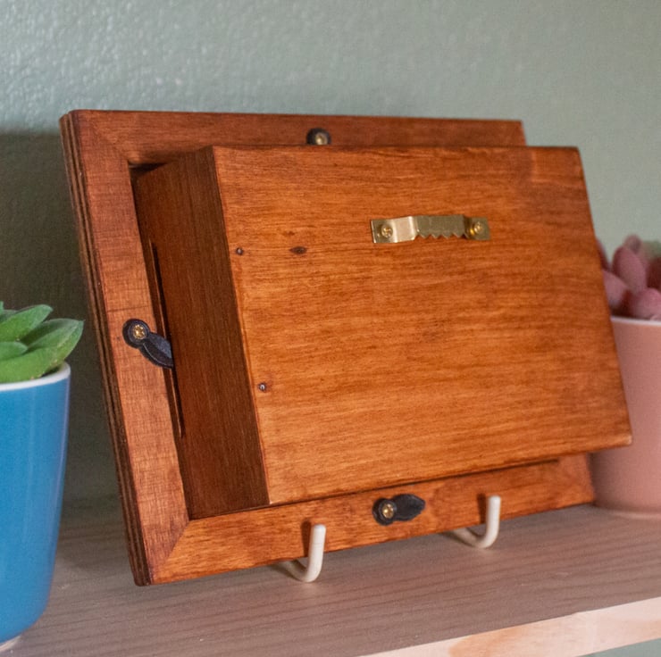 Materials: Plywood, acrylic paint, varnish, stained wooden frame with clear removable perspex
