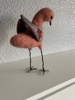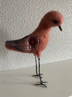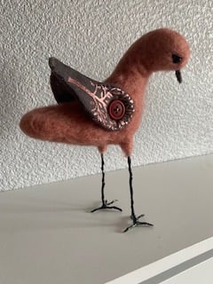Meet Cristen the WAFFA Bird – This colourful little bird is a Wild and free fibre art bird. Needlefelted on a wire frame in light pinky brown with wire legs and feet, She Stands approximately 20cm to the top of her head with colourful wings made from cotton fabric attached with a button so they can be adjusted. With black bead eyes and brown beak. As she is made on a wire frame, her head can be adjusted to look to the side should she sees something of interest. She does look a bit like a seagull, so keep an eye on your ice creams!