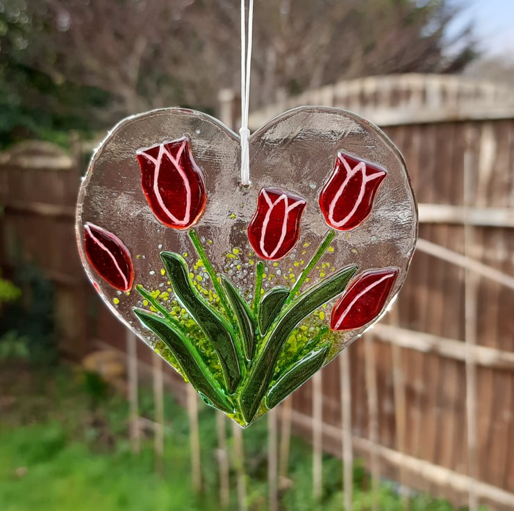 I love spring, seeing flowers begin to emerge and the fresh green leaves springing forth. This glass heart captures the joy of tulips bursting into life and the bright colours of a new spring day.