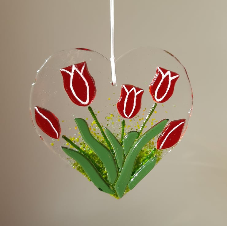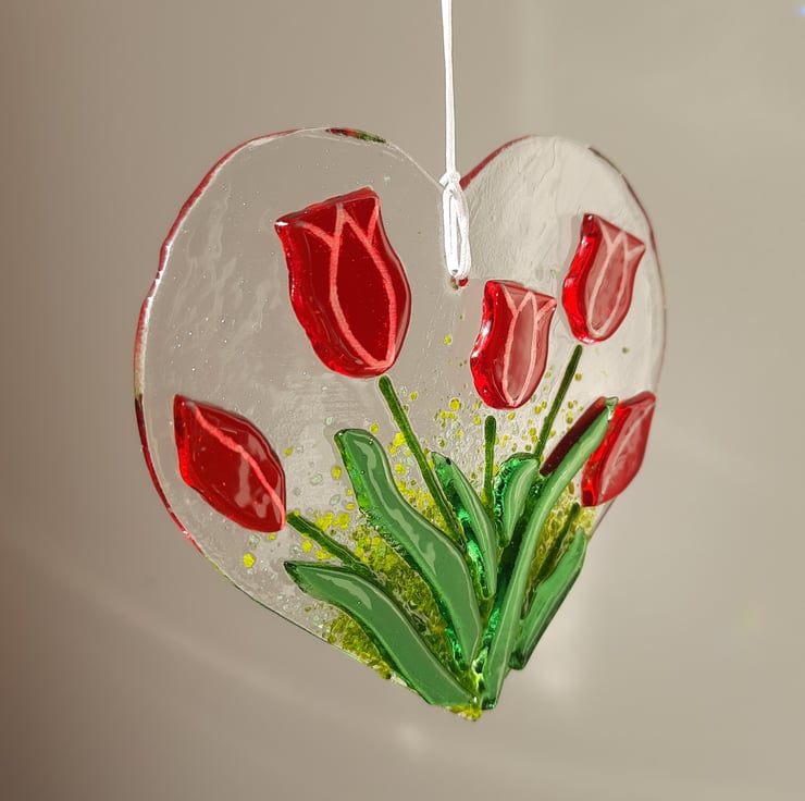 A heart shaped fused glass hanging decoration featuring 3 open and 2 closed tulips in a beautiful red colour. The heart is hanging on a white cord.