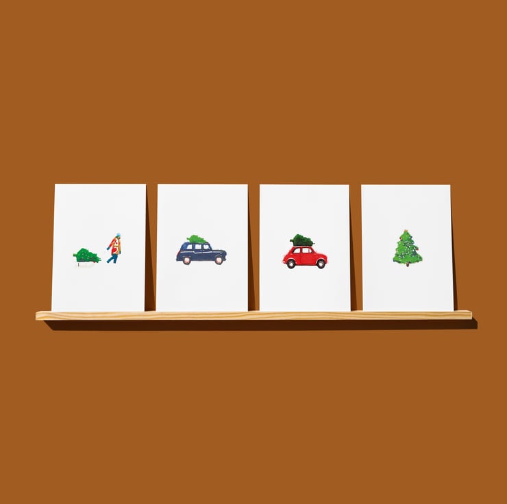 Christmas cards: This is a pack of four different A6-size watercolour style designs all featuring a Christmas tree (perhaps it should be entitled 'how on earth am I going to get this home?').