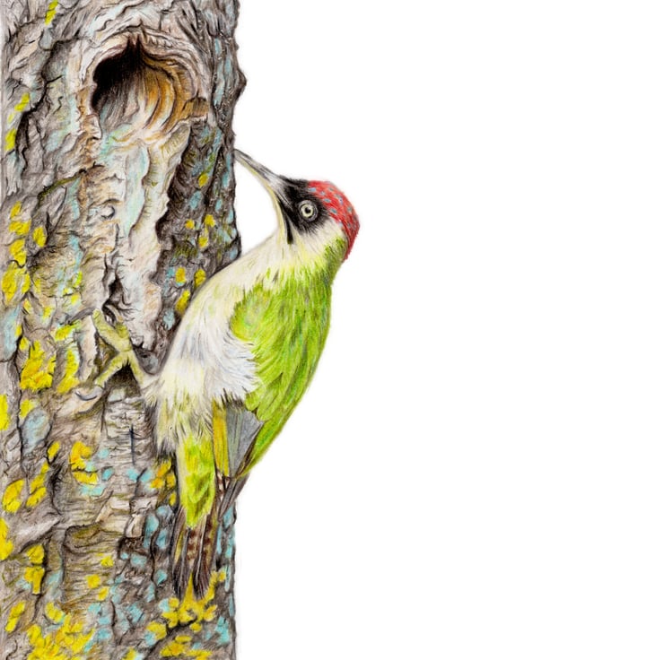 This green woodpecker greetings card is individually printed from an original coloured pencil drawing.