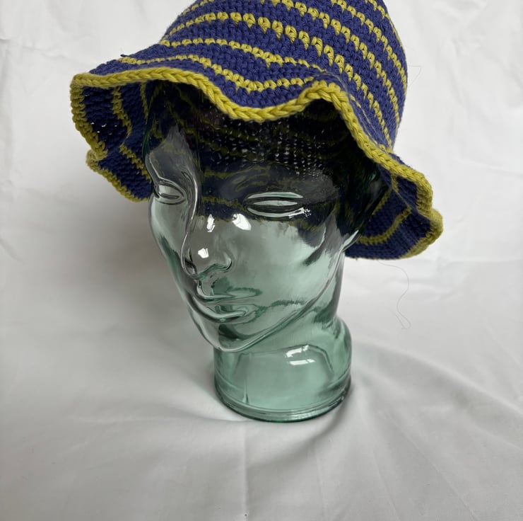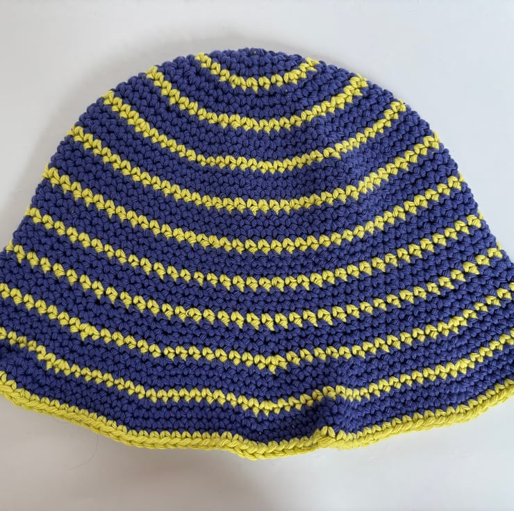 100% cotton crocheted summer hat with floppy rim in royal purple and lemon.