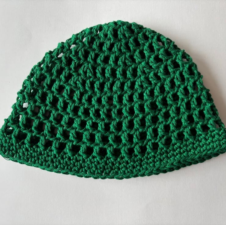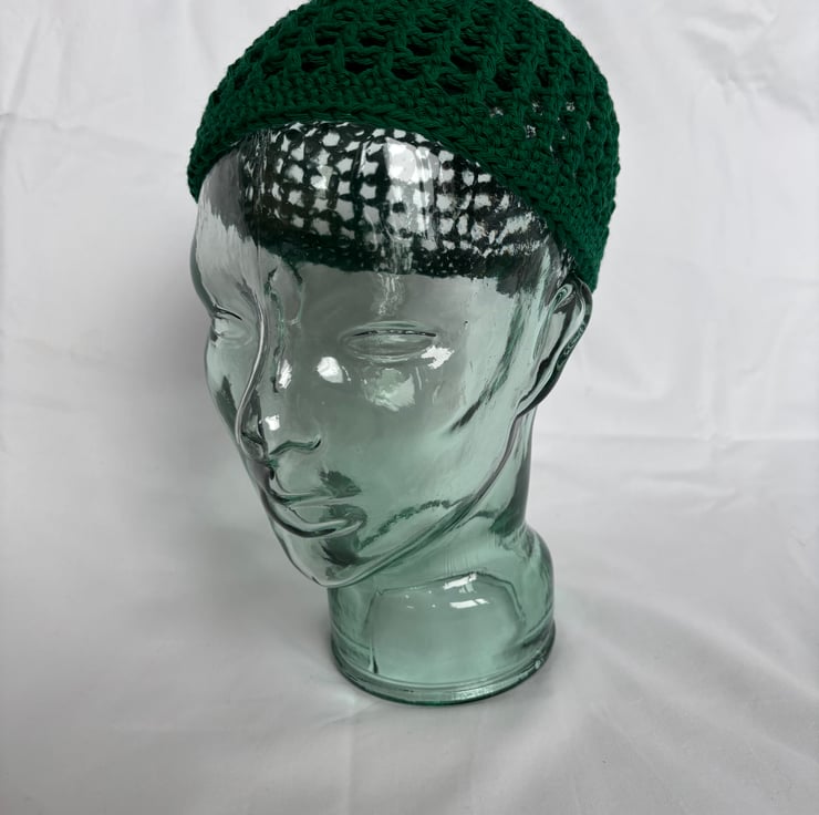 Crocheted mesh skullcap in emerald.