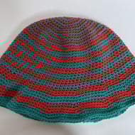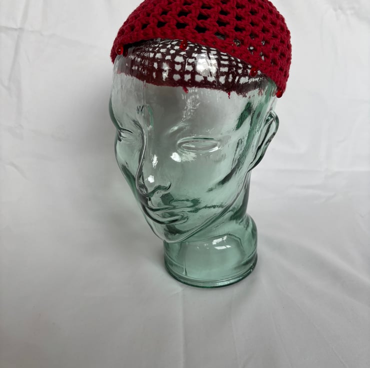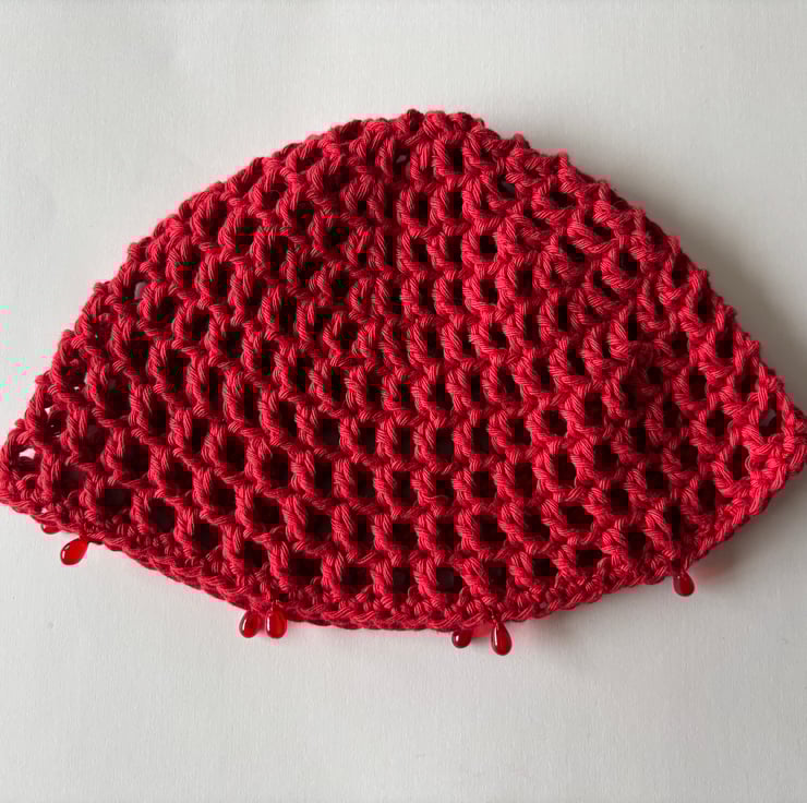 Crocheted mesh skullcap with drop glass beads in ruby.
