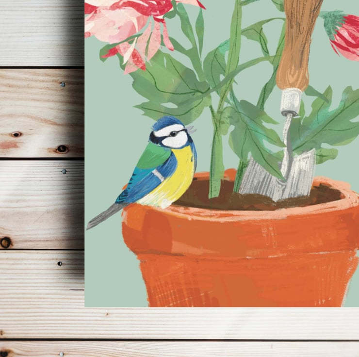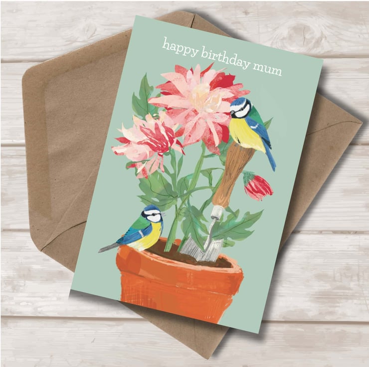 Beautiful Chrysanthemums with cute little blue tits to send a special greeting for your mum on her birthday. This card is an original art and design by The Hedgerow Artist.