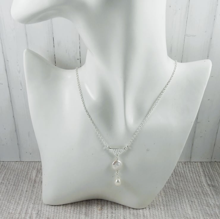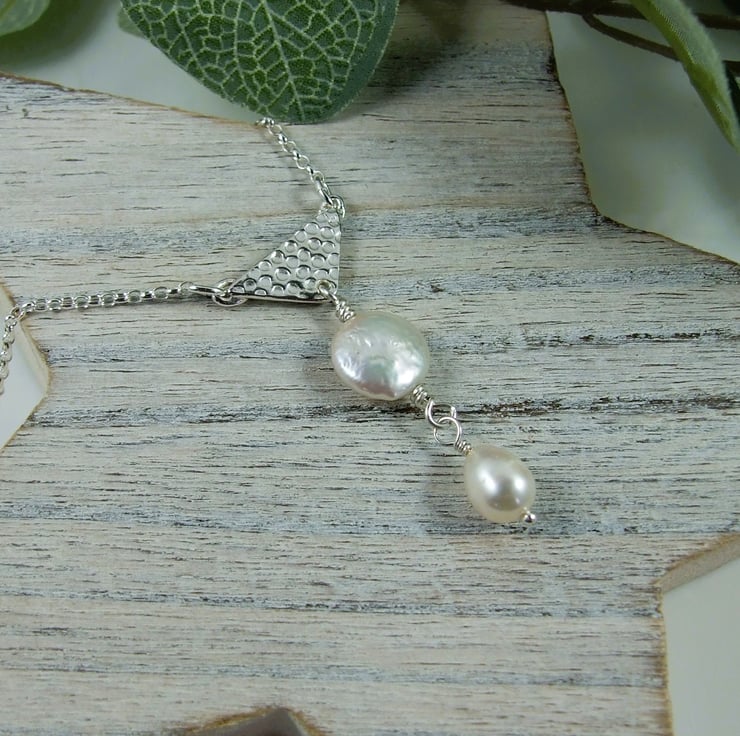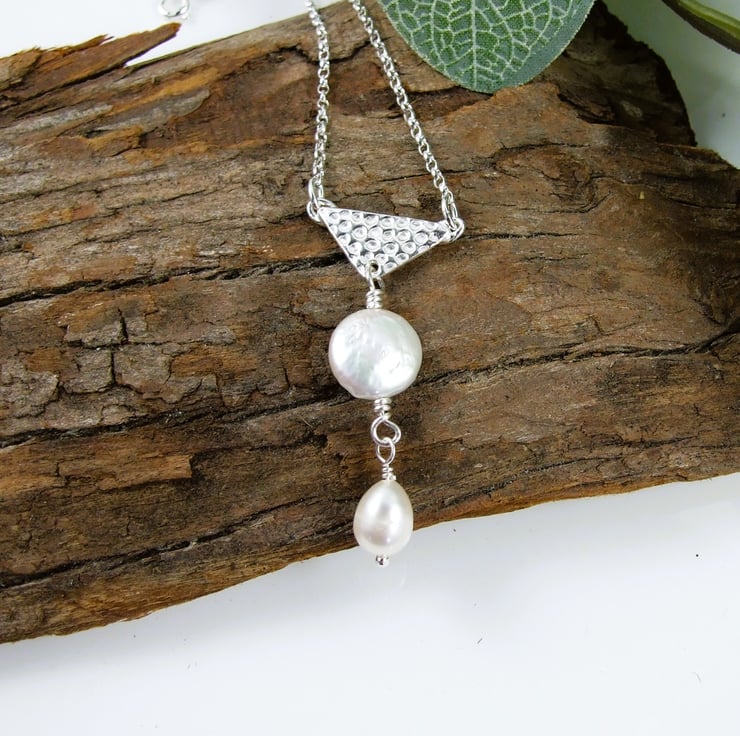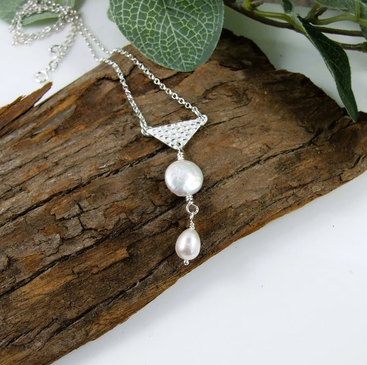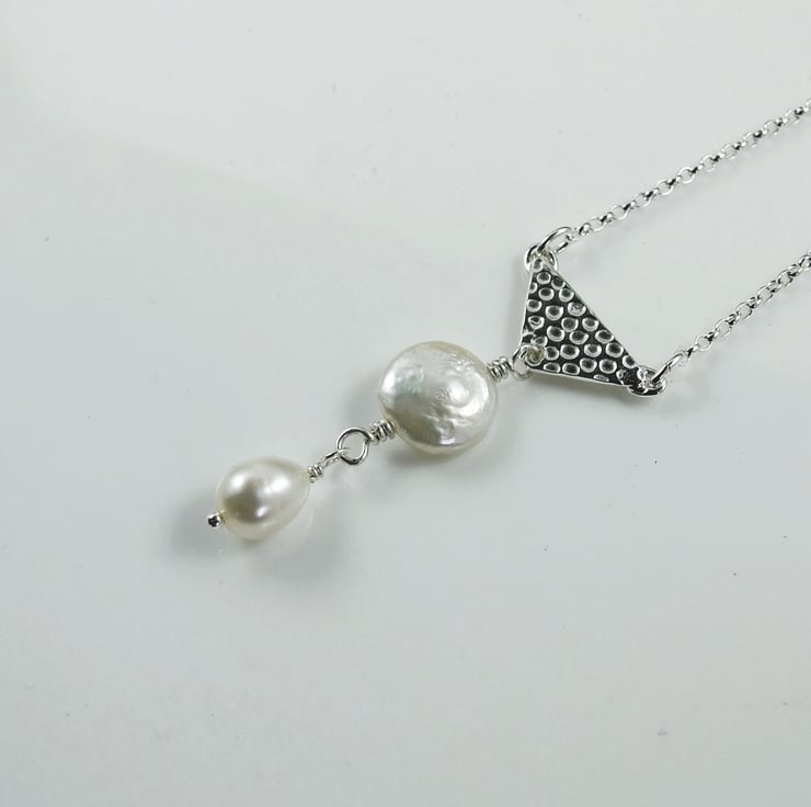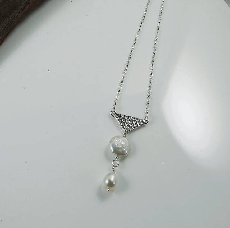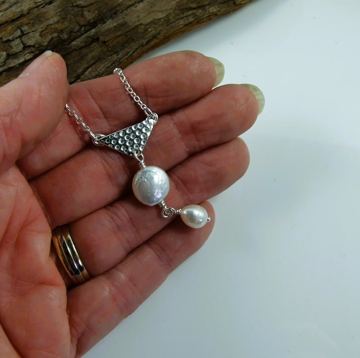 I began with the small silver triangle, cut from silver sheet and textured with a dotty pattern. At the bottom I have added a small coin pearl with a lovely iridescent finish and below that a small teardrop shaped pearl, all securely wire wrapped in place. Suspended from an 18 inch sterling silver chain.