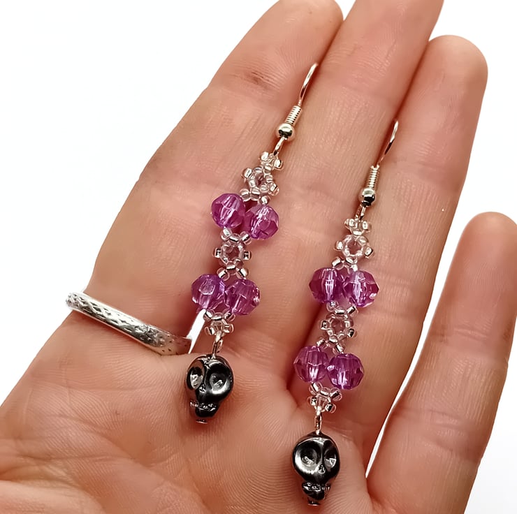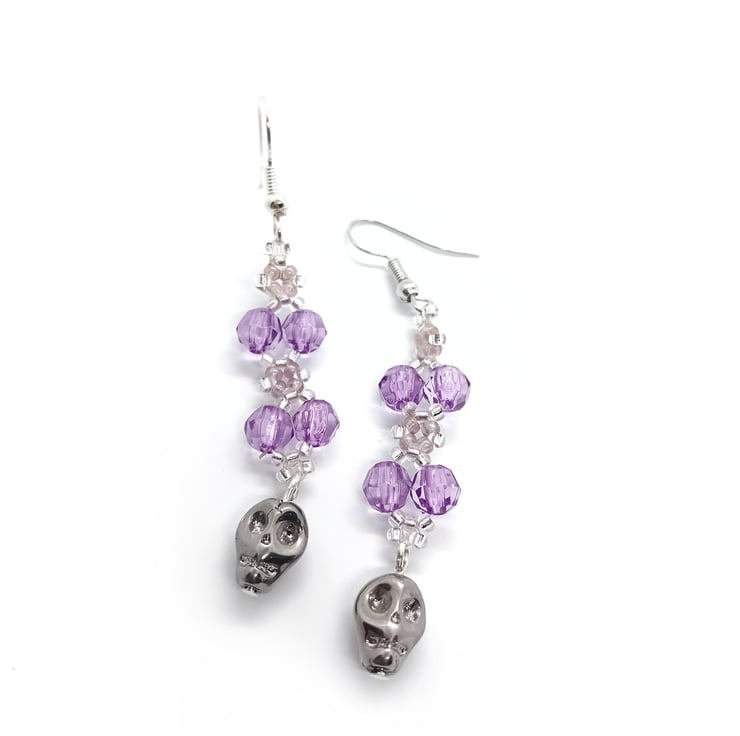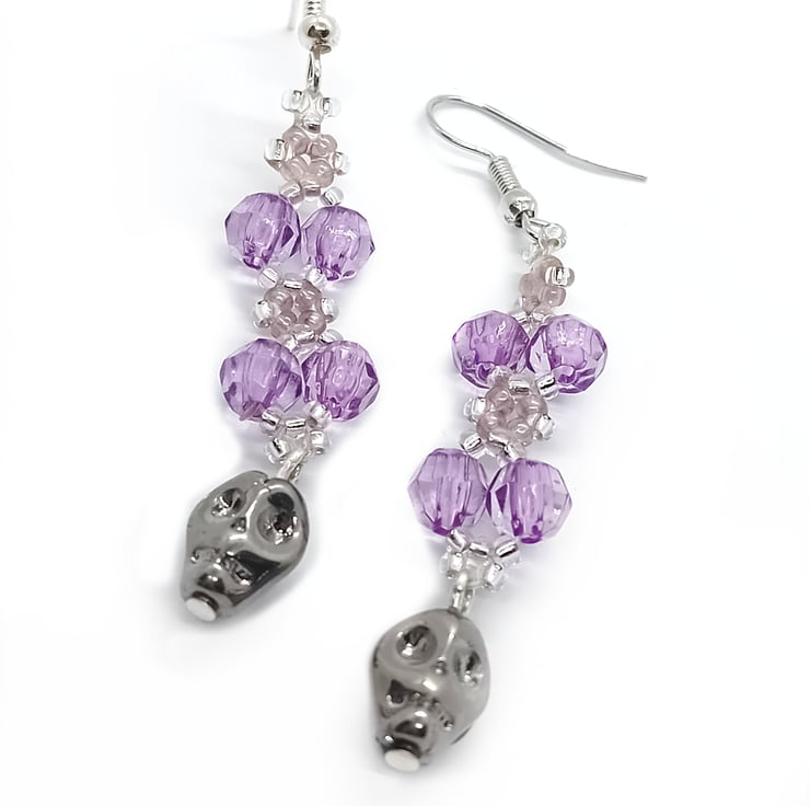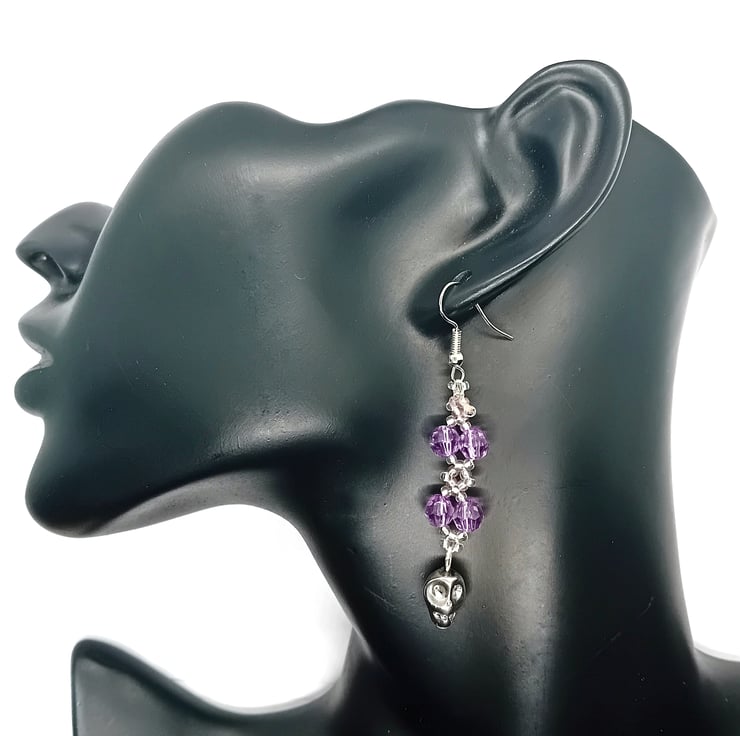 These gothic and funky purple and silver skull dangle earrings are made with purple, faceted acrylic faceted beads and gun metal skull beads. These add some edge and some sparkle to your lobes.