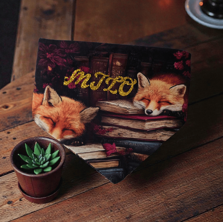 Great bandana made from good quality material comes in 3 sizes and can be personalised bandana as scruchie style back so no need for collar and be slipped over head making it very comfortable se sizes below