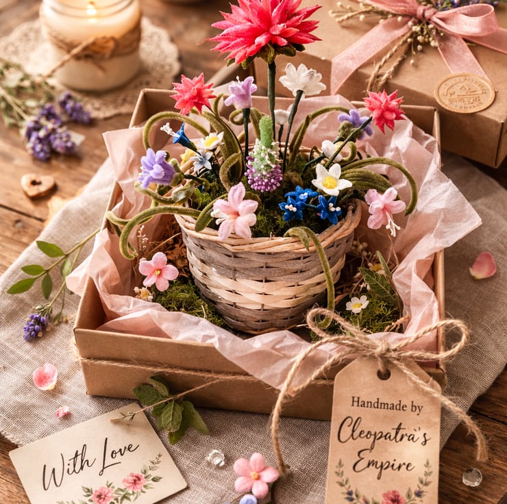 Each flower is individually handmade using pipe cleaners and tiny decorative details, making every basket completely unique.