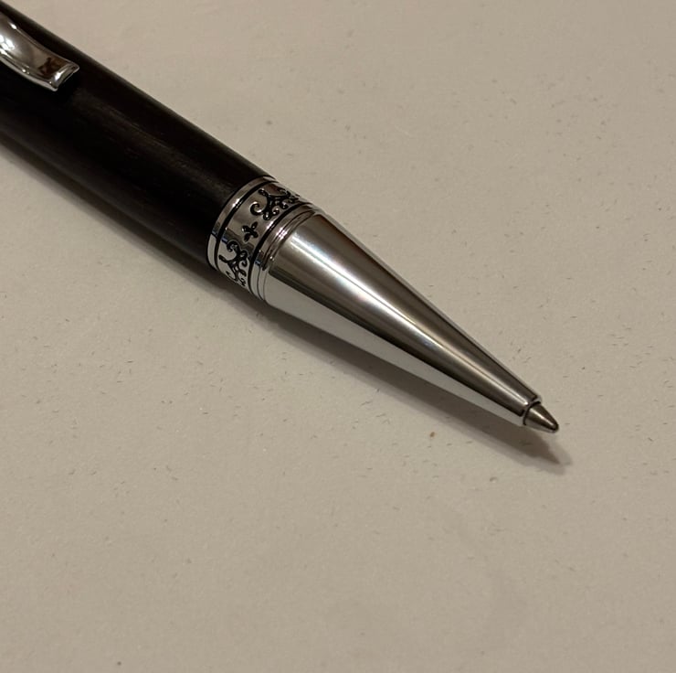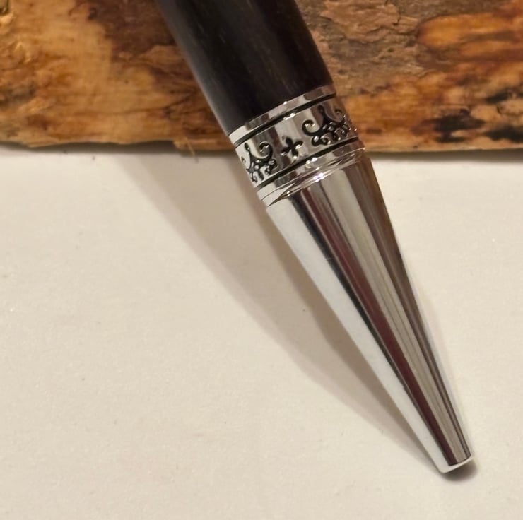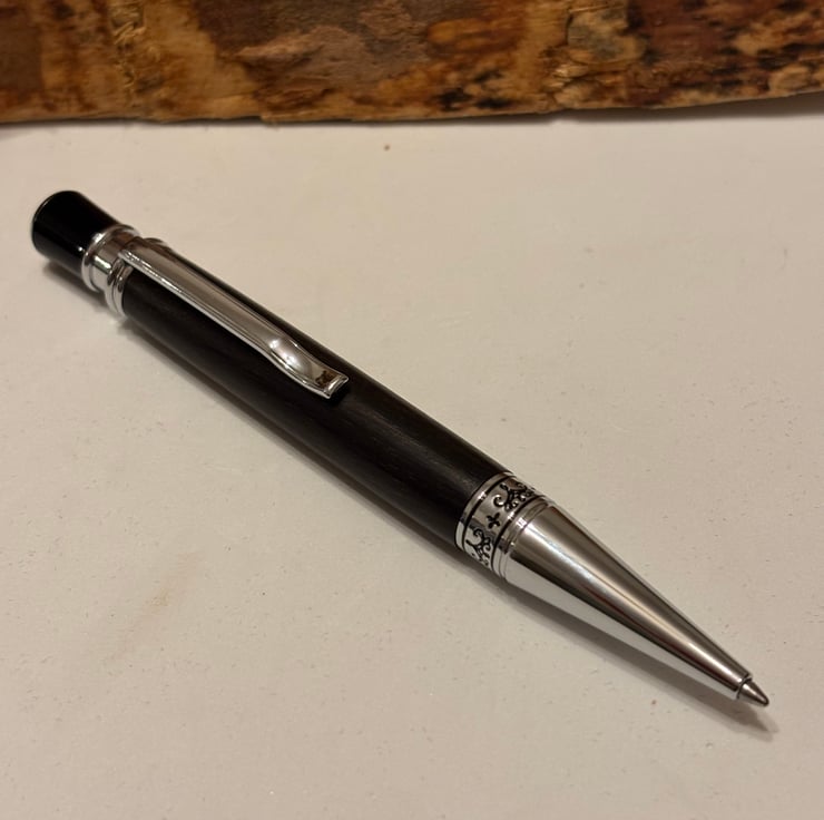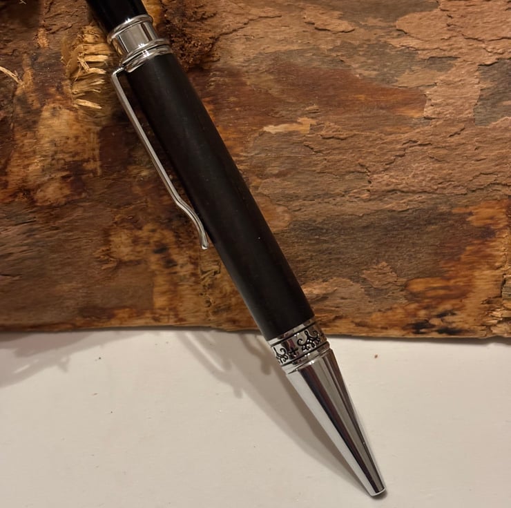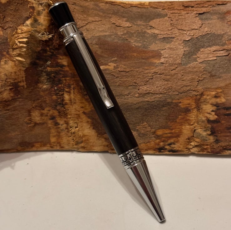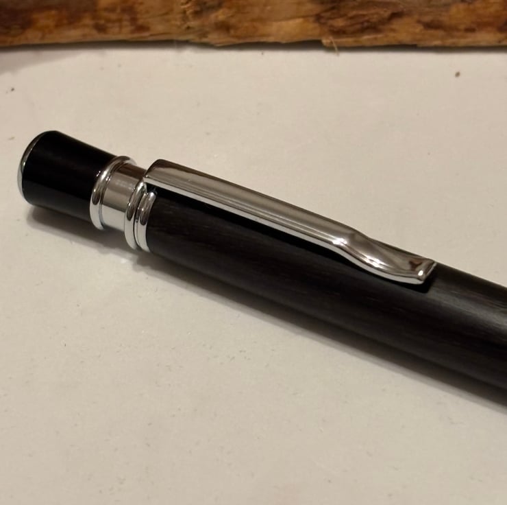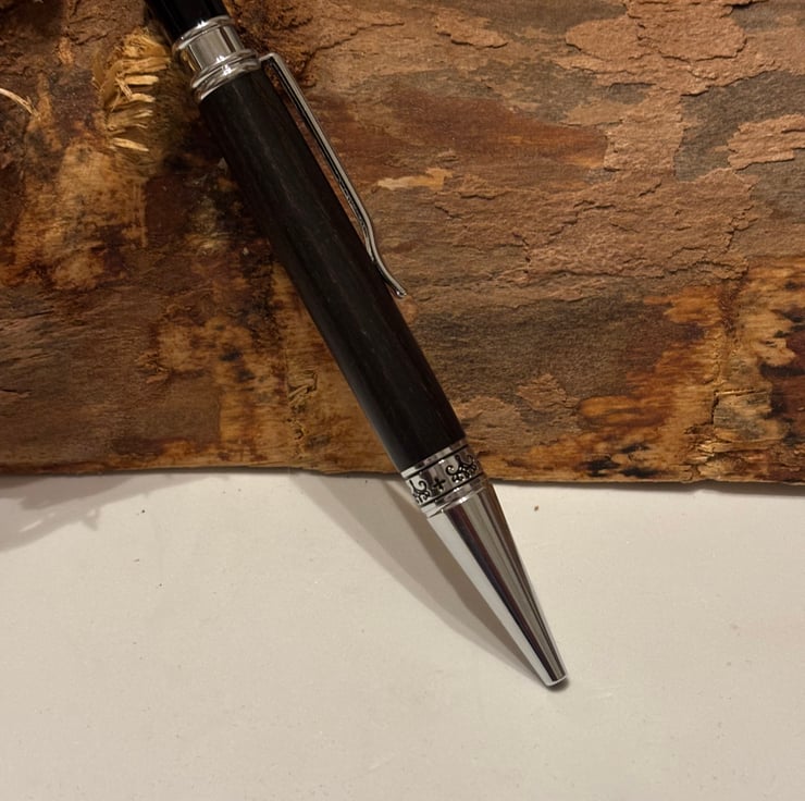 Aquilo style ballpoint has a stunning look by combining the dark coloured Bog Oak with chrome fittings. Handmade by me in my workshop in Leigh.
