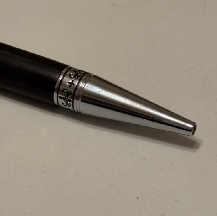Immerse yourself in history with this exquisite, handcrafted pen. This unique writing instrument is turned on a lathe from a rare piece of bog oak, a wood preserved in the anaerobic conditions of a peat bog for approximately 3500 years. This oak tree was a living, breathing organism during the Bronze Age.