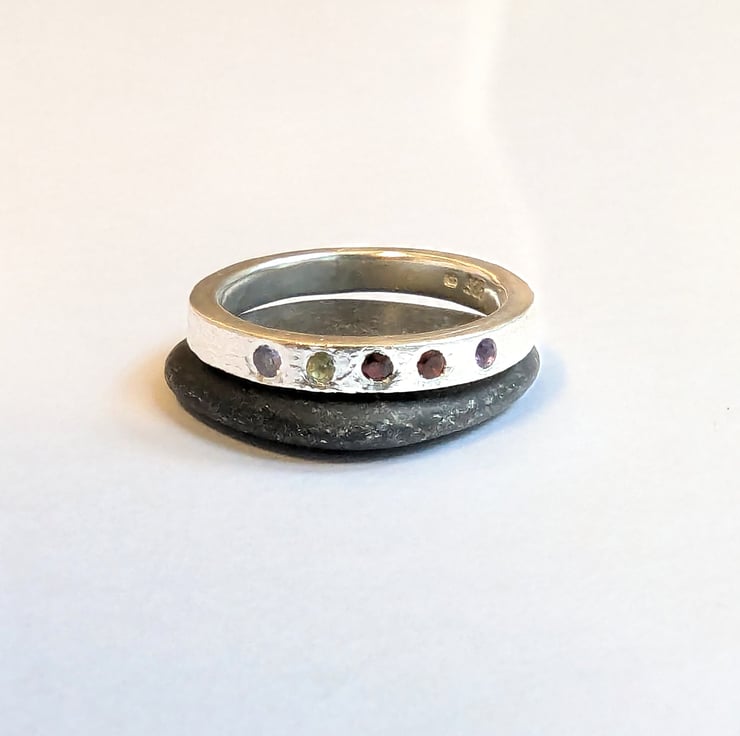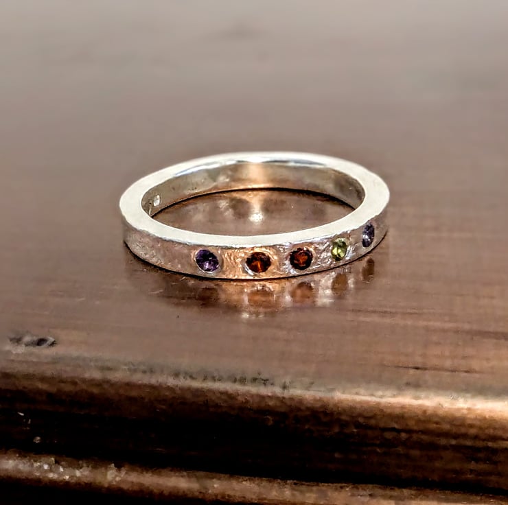 Recycled sterling 5 gemstone reticulated textured ring