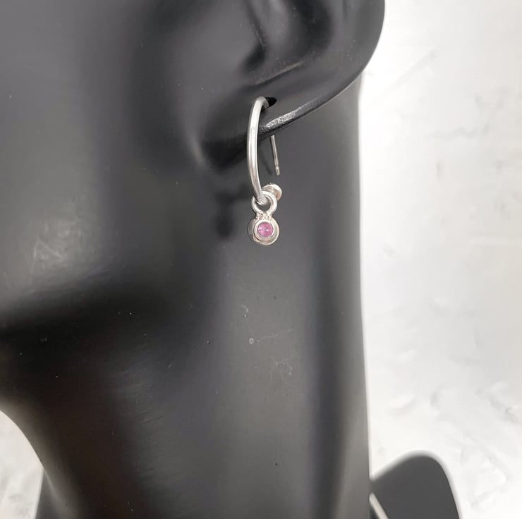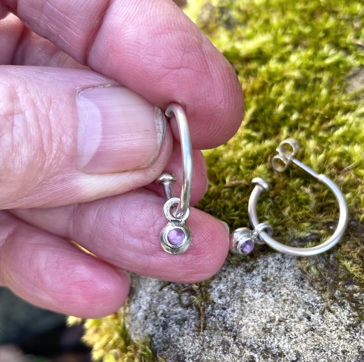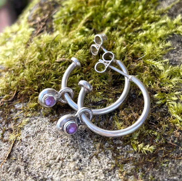 Handmade recycled silver hoop studs with small amethyst dangles.