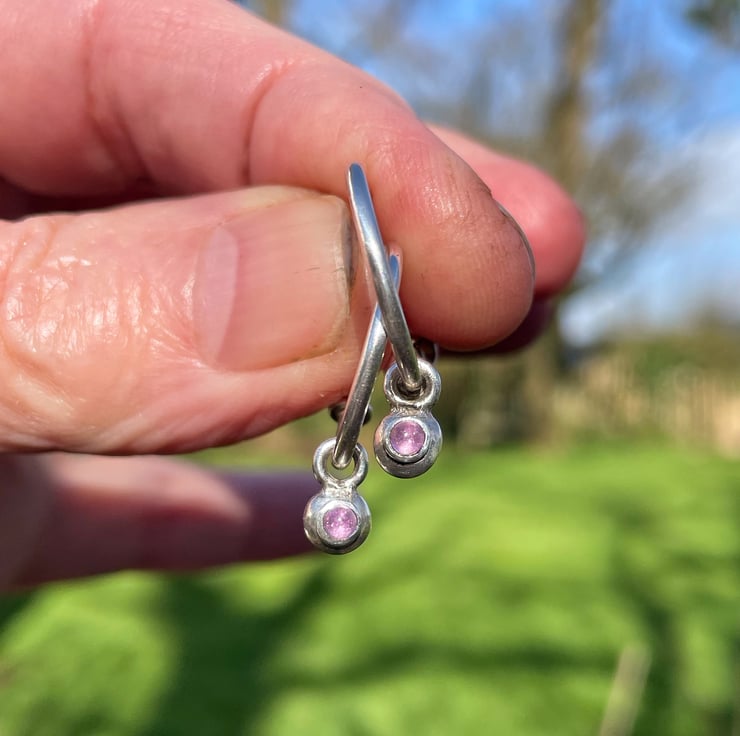 These hoops are made from 1.4 mm round wire, they have a stud and butterfly closure and have rings soldered at the ends to stop the small charms sliding off.