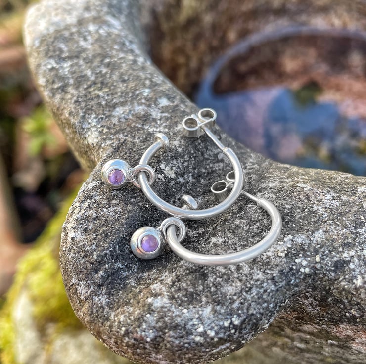 The hoops are 18mm diameter. The little dangles are 5mm wide, and are set with 3mm cabochon amethysts.