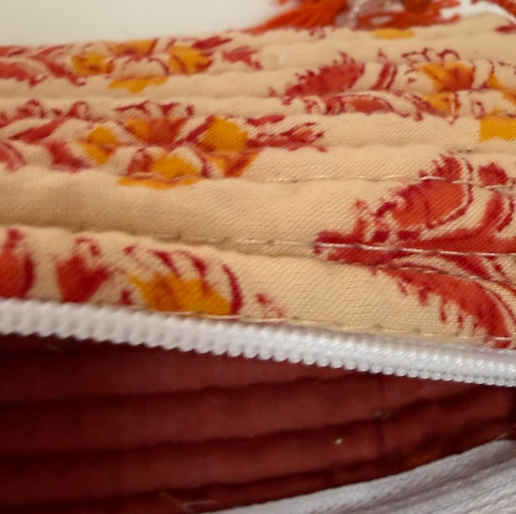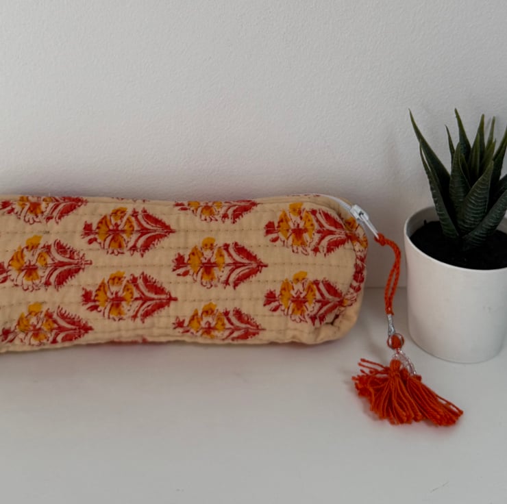 Handmade quilted cotton pencil case or sleek makeup bag with a vibrant floral print.