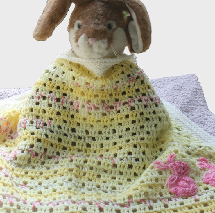 Handmade crochet baby blanket in soft pastel yarn with crocheted bunny applique detail. It features four, pink blossom yarn rabbits, (two on the left of the blanket and two on the right). It is made from 70% acrylic and 30% nylon, and the border is made from 100% premium acrylic. The rabbits are hand sewn onto the blanket with gutermann thread and each bunny has hand embroidered eyes. The little bows on the rabbits are tied securely and sewn firmly onto the blanket with gutermann thread. The blanket is designed to be both practical and decorative. It is machine washable and care guidance will be sent with purchase.