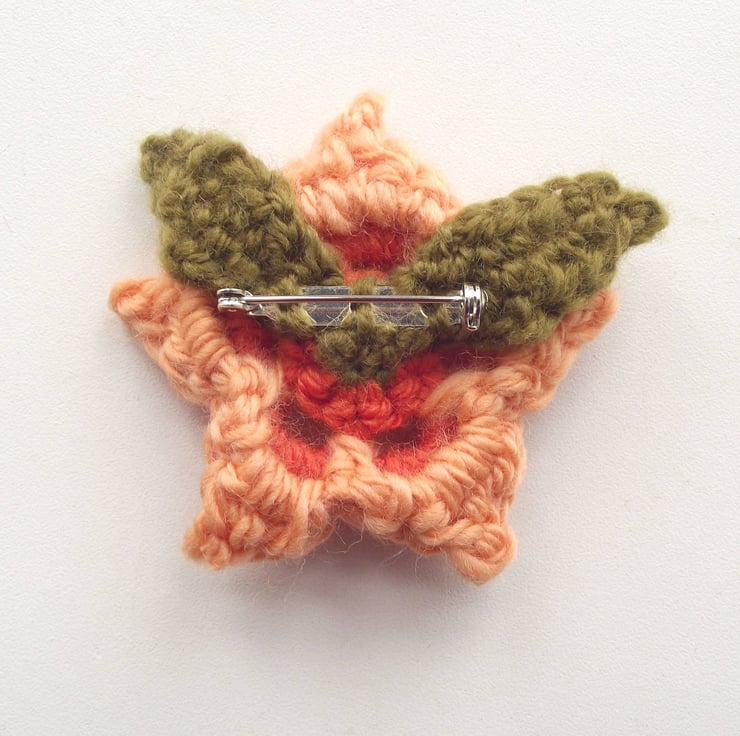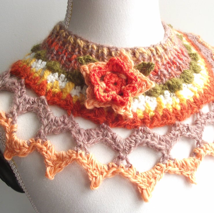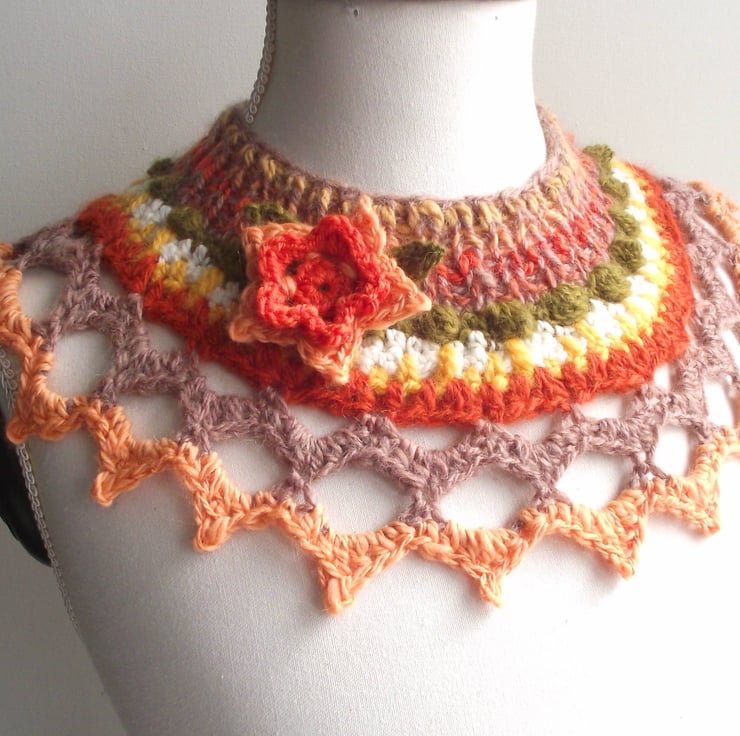 This unique collar, cowl or yoke was knitted AND crocheted using handspun yarns in shades of peach, green, fawn, rust and white. 'Freeform' simply means made without a pattern. I handspun all the merino wool yarns - definitely NO man made synthetic fibres. I have used lots of textured stitches such as bobbles, shells, eyelets, finishing with a pointy peach border. I have included a DETACHABLE crochet flower in coral and peach with two green leaves. It has a silver-toned brooch back so that you can easily attach it to the collar exactly where you wish.