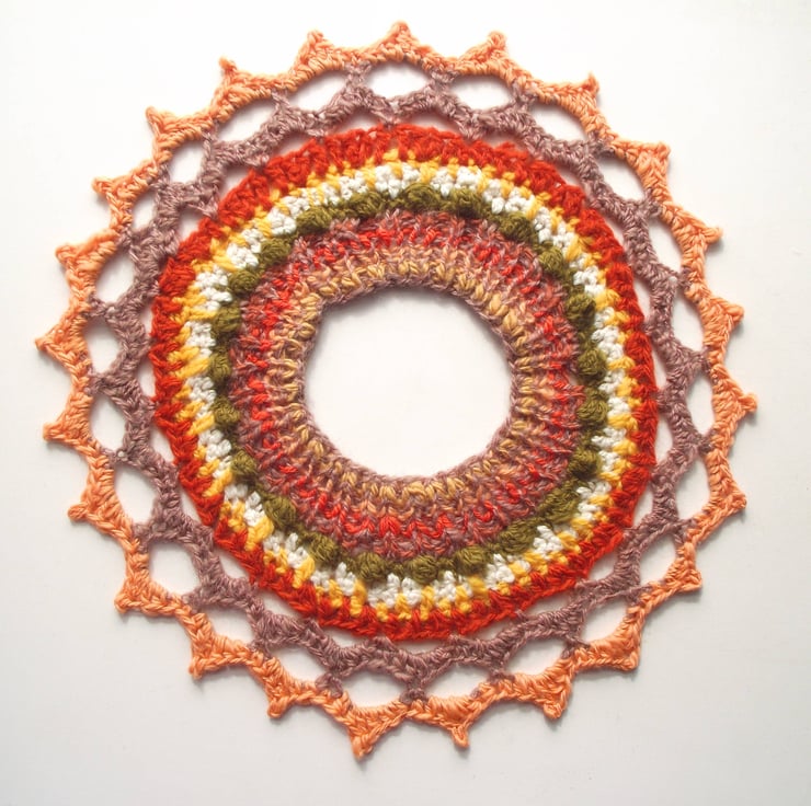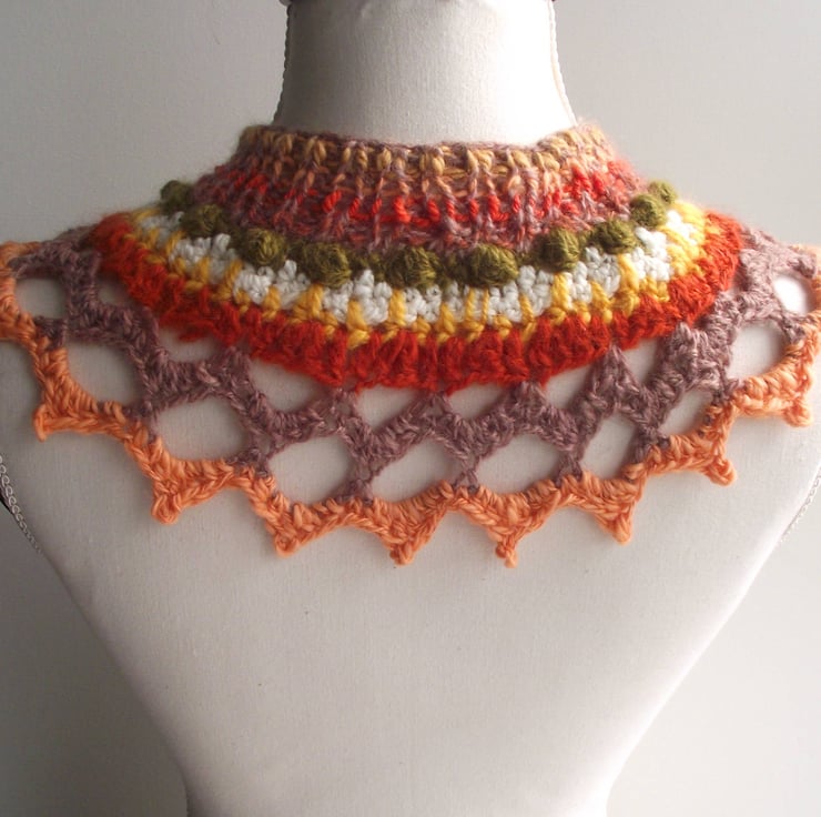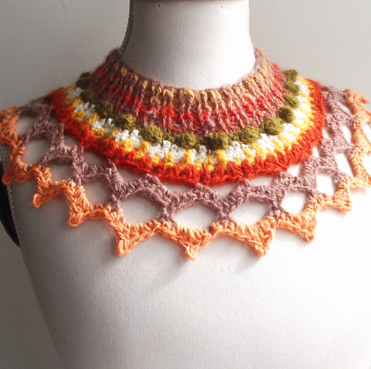 Freeform Collar, Yoke or Cowl. Handspun Knit & Crochet Wool. Peach, Green, Fawn