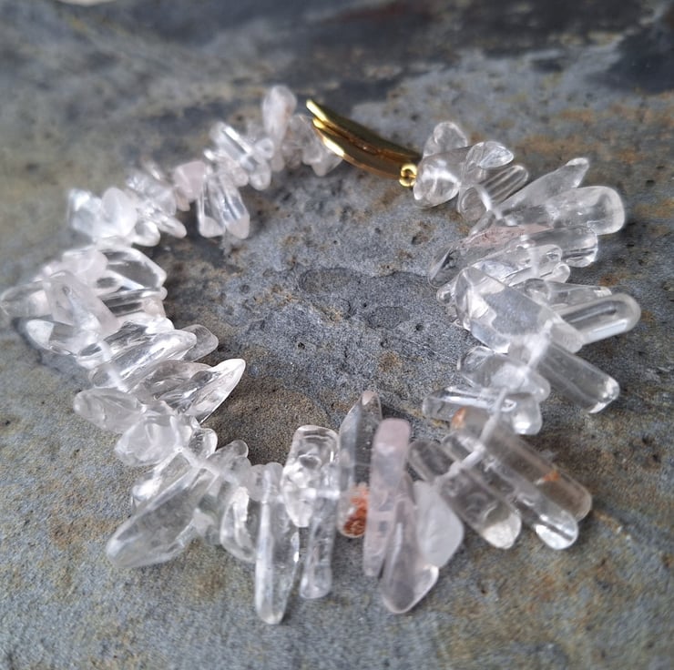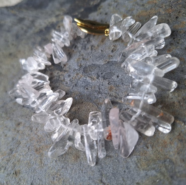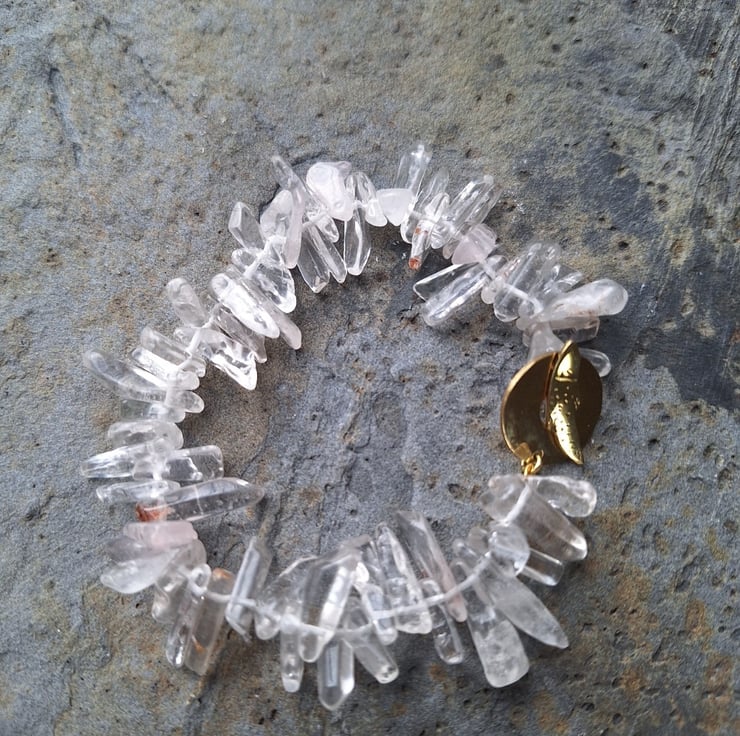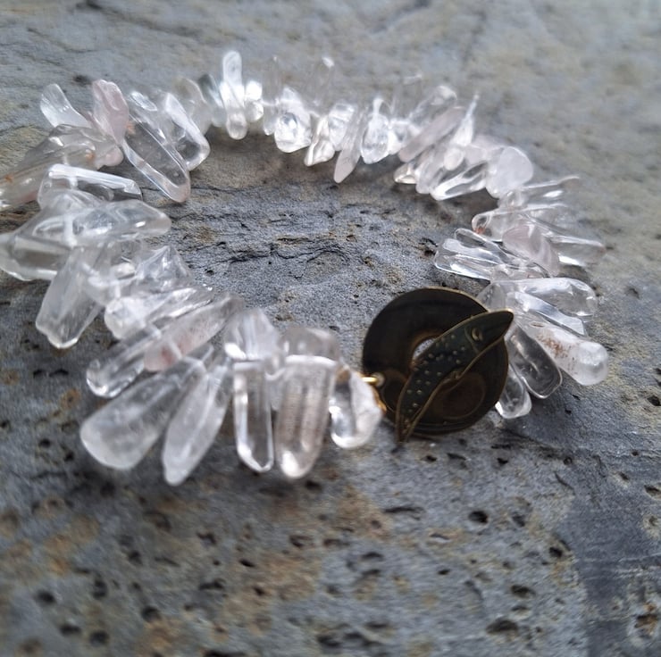 The bracelet itself is crafted from hand-strung, polished quartz chips. It's a cheerful, organic accent that brings a touch of natural brightness to any wrist.
