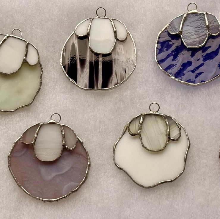 Each sheep is hand cut and crafted using the Tiffany foiled glass method. Every section of glass is edged with copper foil, soldered, and cleaned. Craft glass often contains tiny natural marks or variations which make every piece original. Colours are shown as accurately as possible although screens may vary.