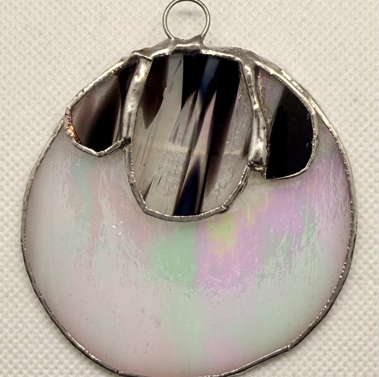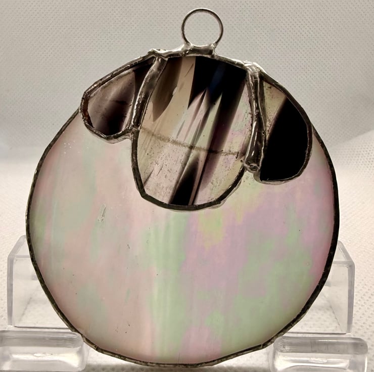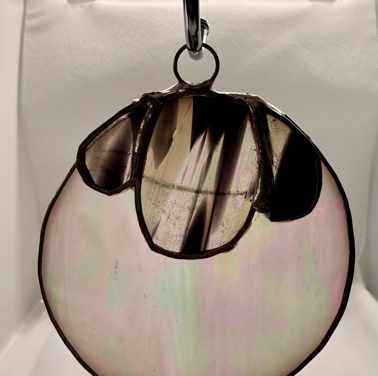 This stained glass sheep suncatcher is a bright, eye catching piece made with iridescent white glass for the body and a splodgy black and white glass for the face and ears. The body shimmers with soft rainbow tones when the light moves across it, while the patterned face adds a playful, expressive charm.