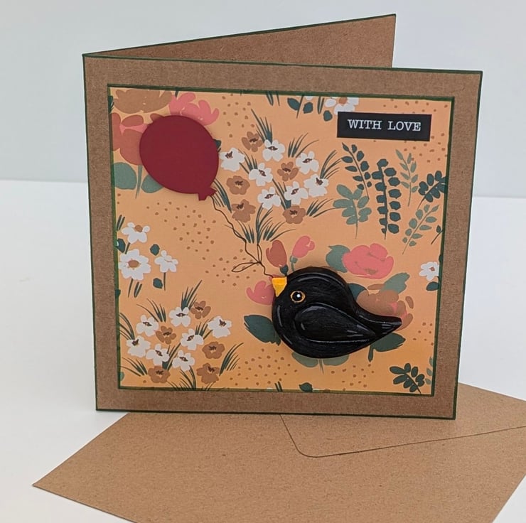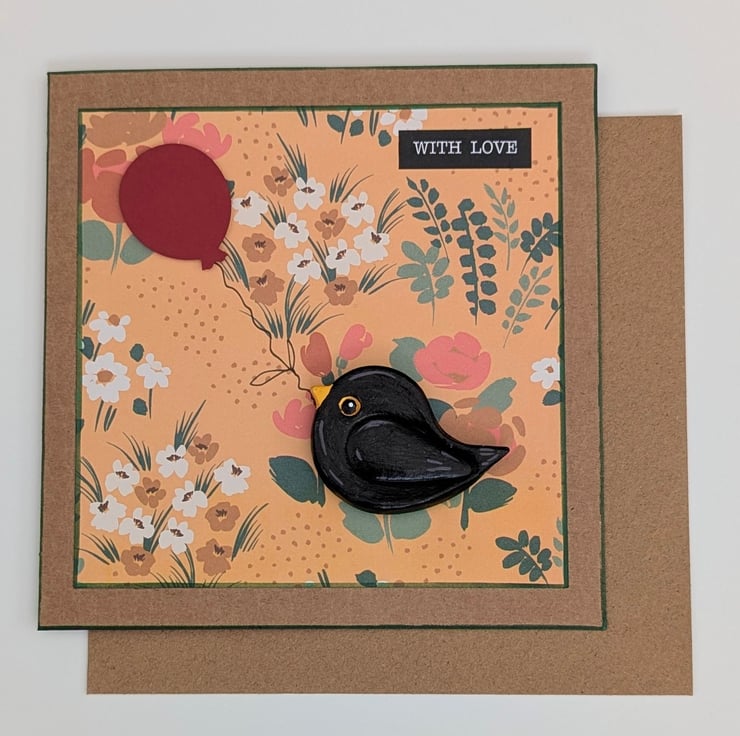 Pretty handmade card perfect for bird lover with a detachable hand painted blackbird fridge magnet keepsake. The pale brown card has been layered with a floral paper, "with love" sentiment and a cardboard red balloon embellishment the string of which the cute blackbird is holding in his beak. The delightful little blackbird has been lovingly made from air dry clay and hand painted and varnished and attached to the card using a glue dot but can easily be detached from the card after use. The reverse of the bird has a long strip magnet which will attach to any surface with magnetic properties. The card has been left blank inside for your own message making it suitable for lots of occasions. This square card comes with a matching envelope and the back of the card has a Crafty Nature label. The card will come supplied in a protective cellophane bag inside a postage box so it does not get bent.