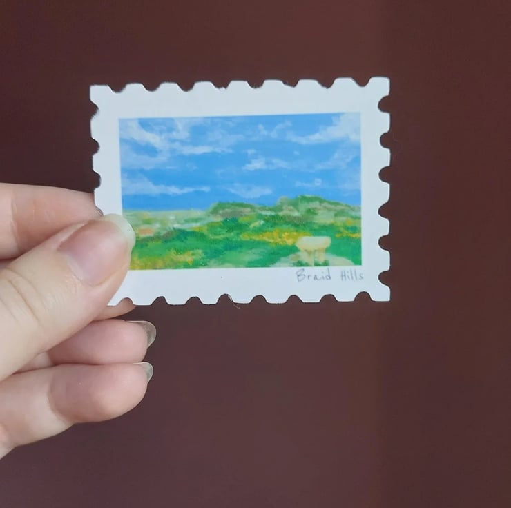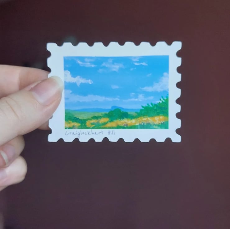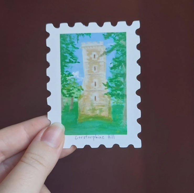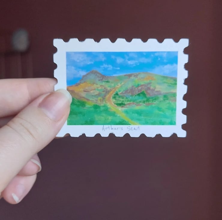 A pack of stamp shaped matte stickers of the 7 hills of Edinburgh; Castle Rock, Arthur's Seat, Blackford hill, Braid Hills, Corstorphine Hill, Craiglockhart Hill and Calton Hill