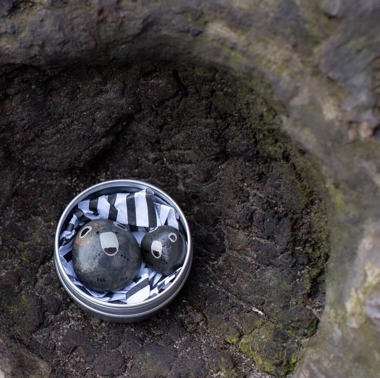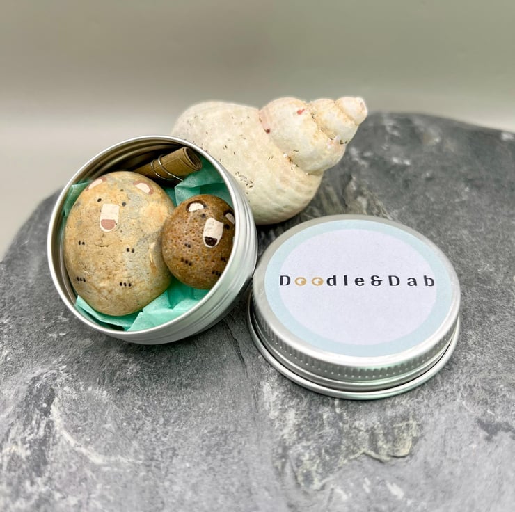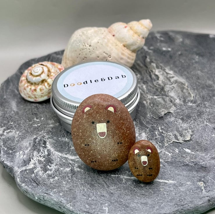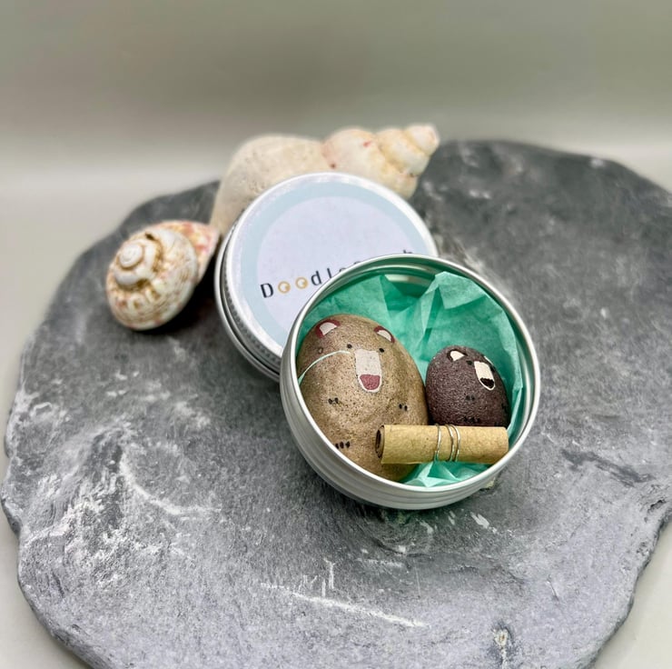 In the tin box you will receive two hand-painted, pocket-sized pebble bears, one big and one little, each with a heart on their back. The little scroll tells you a bit about the pair bears.
