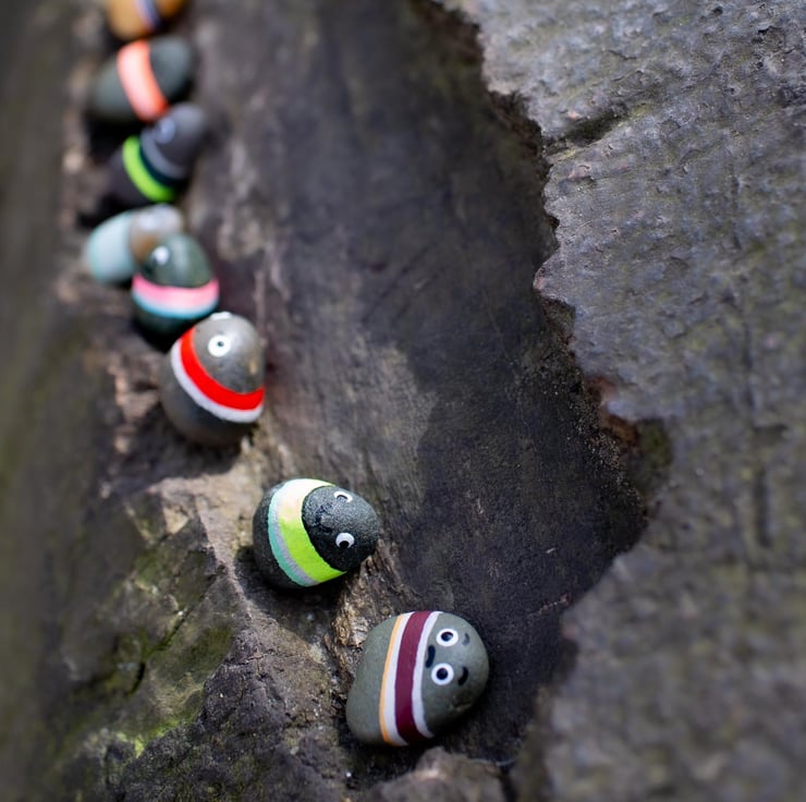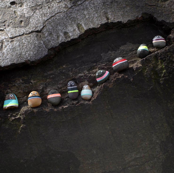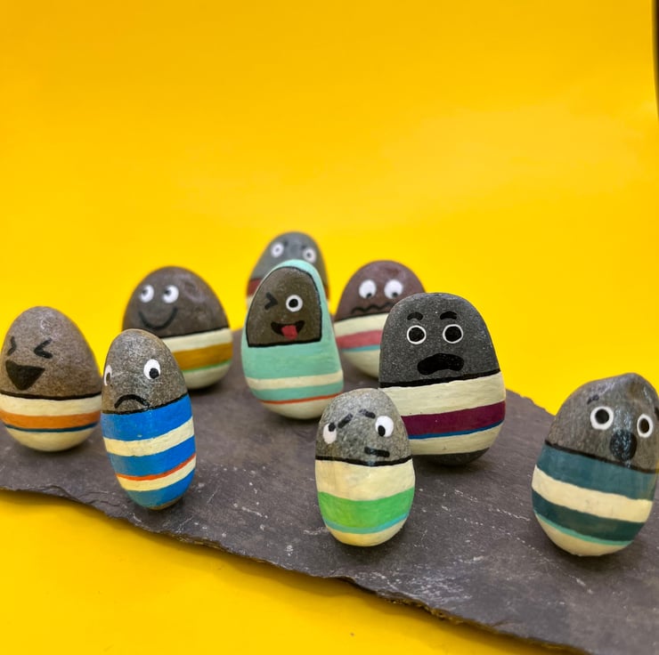 A tin gift box containing nine hand-painted pebble characters that bring to life different emotions.