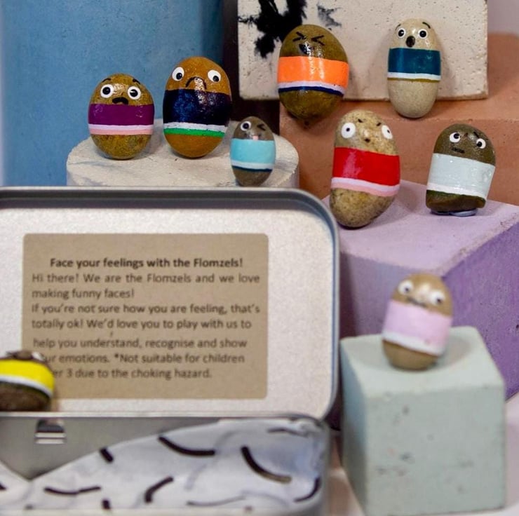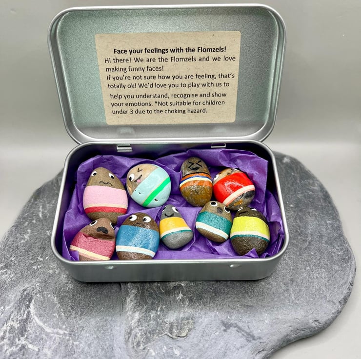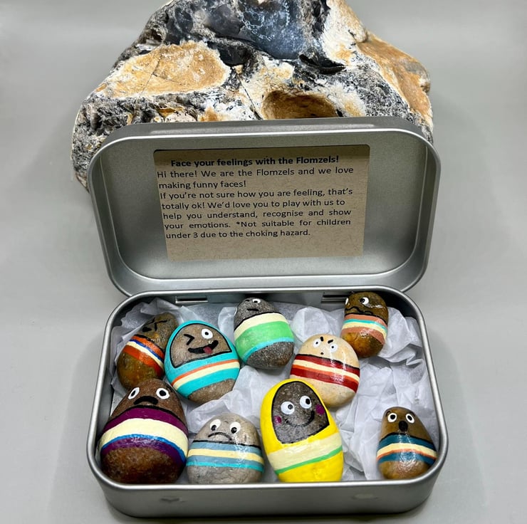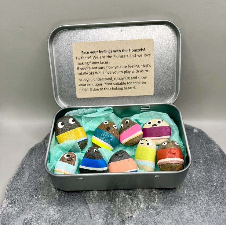 My inspiration came from my son's old primary school SEN teacher who said that children often love tactile things to hold when they are feeling unsure. I thought my Flomzel Feeling Faces would be a good way for people to express how they are feeling by picking out a stone that represents an emotion. They all come in different colours as making up colour combinations are another one of my favourite things to do.