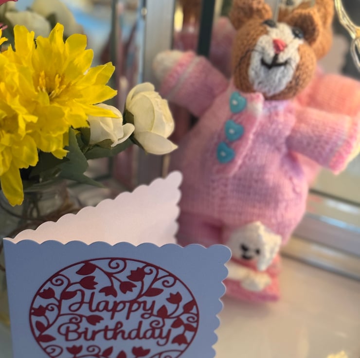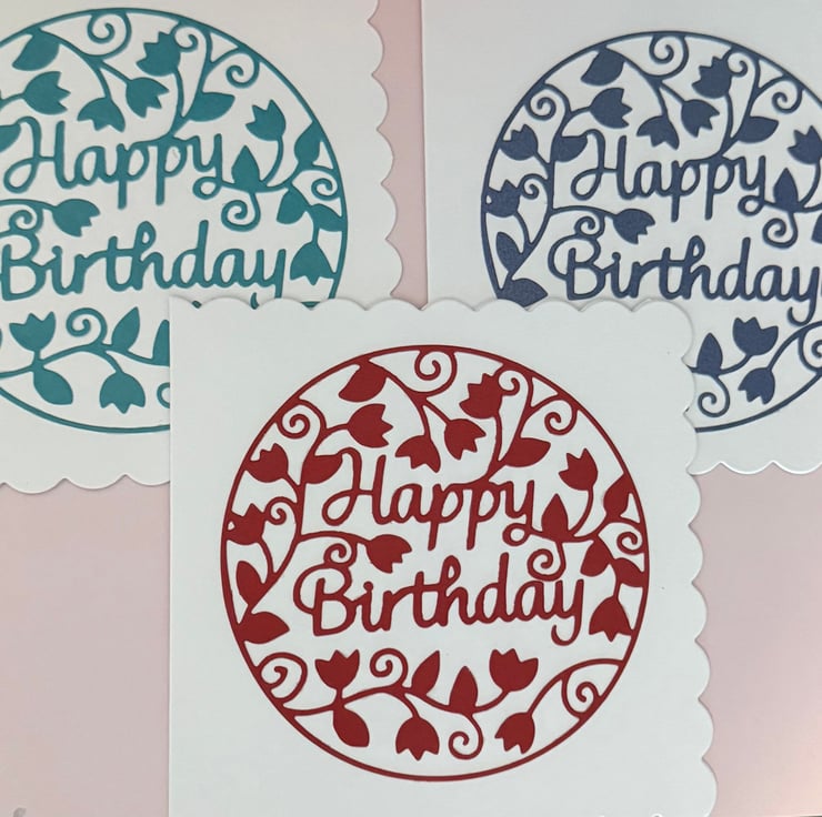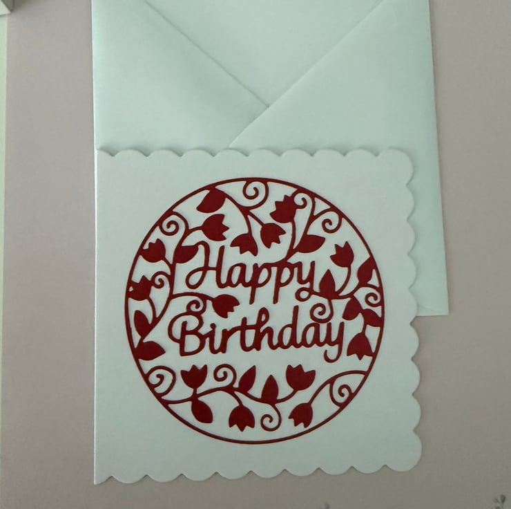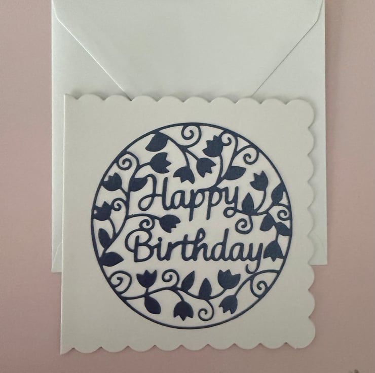 Scalloped edge card with Happy Birthday on the front. Card has an envelope with it and the card will be in a cello bag to protect it. Will be mailed in a strong “Do Not Bend” envelope. I use First Class for my items. I have three available - please let me know which colour you would like. The card measures 12.5x12.5cm.