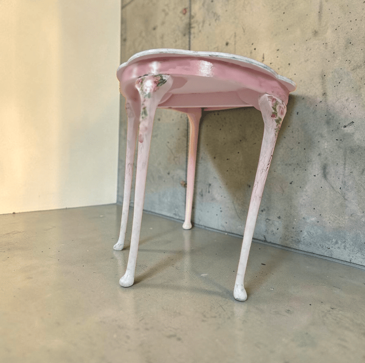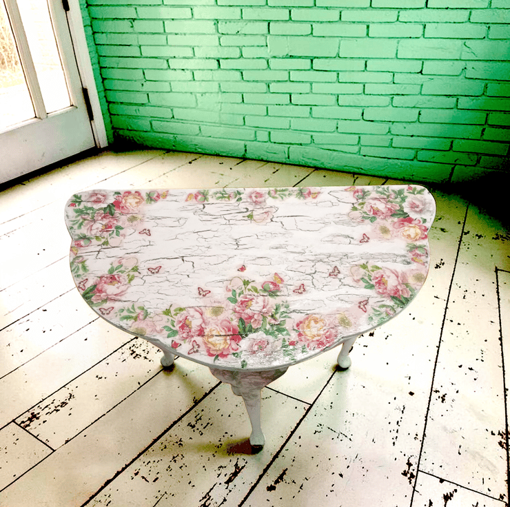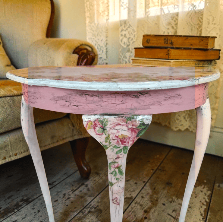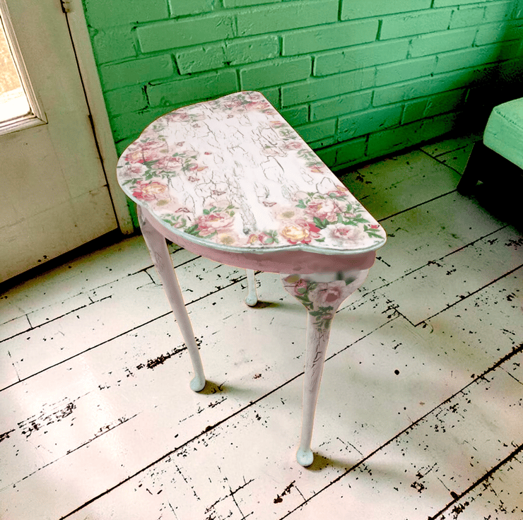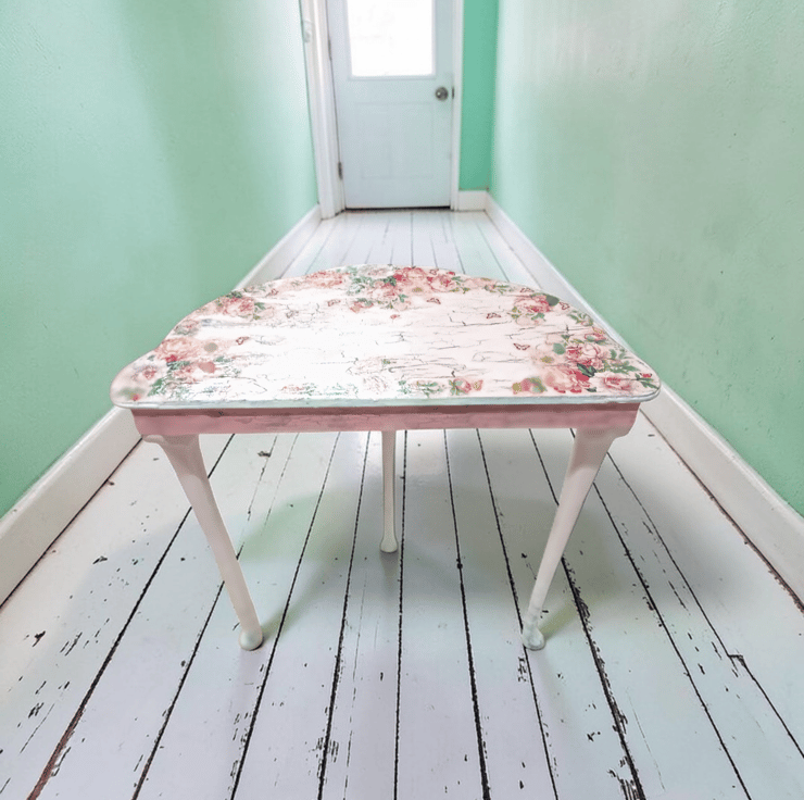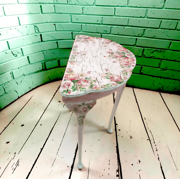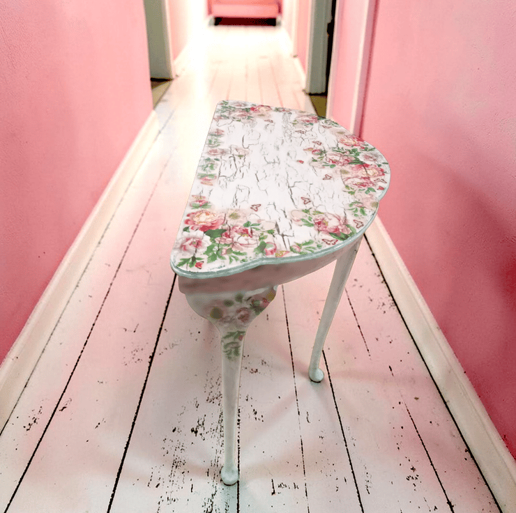 My inspiration for this table comes from my love of rustic country style French furniture, my love of decoupage and re-imagining, designing and creating my own pieces. I knew instantly this beautiful floral design and pretty pale and dark pink colours with white would look beautiful and work brilliantly with this table with its elements of lovely cracked, chipped, distressed paint effect. Whether as a console or occasional table or a standalone decorative table this will be a true statement piece and talking point! Hope whoever buys this gorgeous little gem will love it as much as Ive enjoyed every aspect and stage of its upcycling journey from forgotten, unwanted and discarded demi item to beautiful statement piece loved by its new owner in its well deserved pride of place!