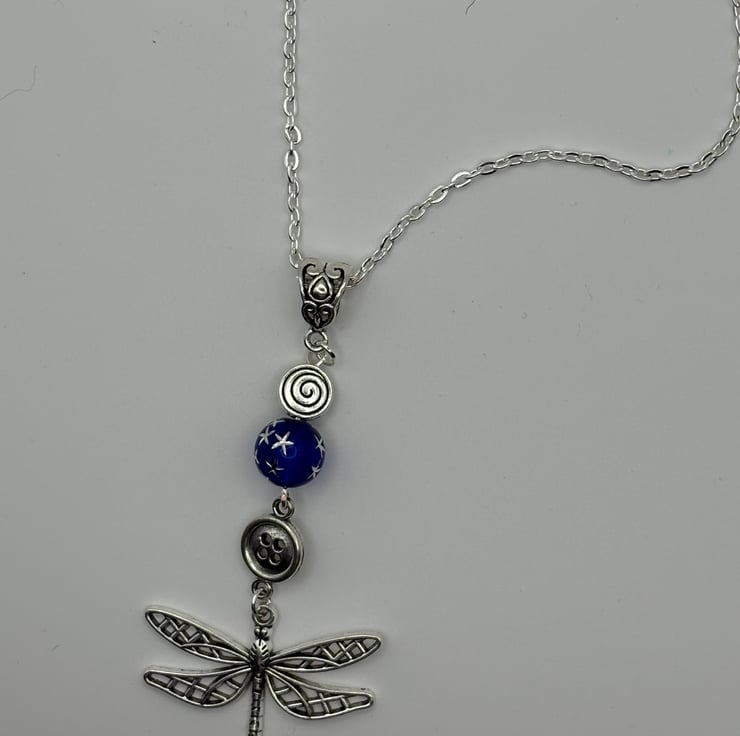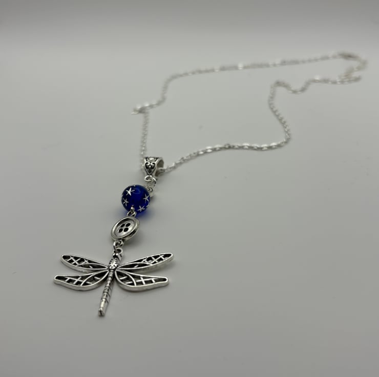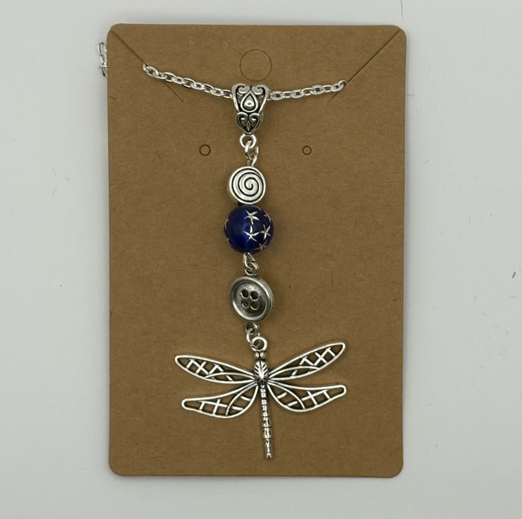 Silver spiral and blue star adorned beads perfectly paired with button and dragonfly charms.