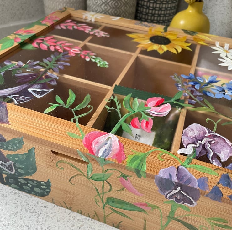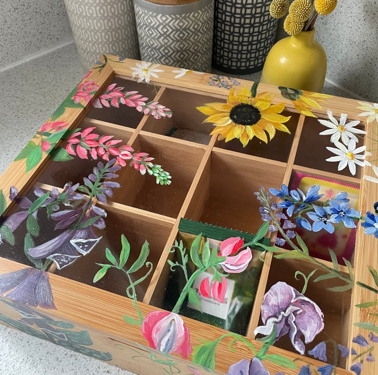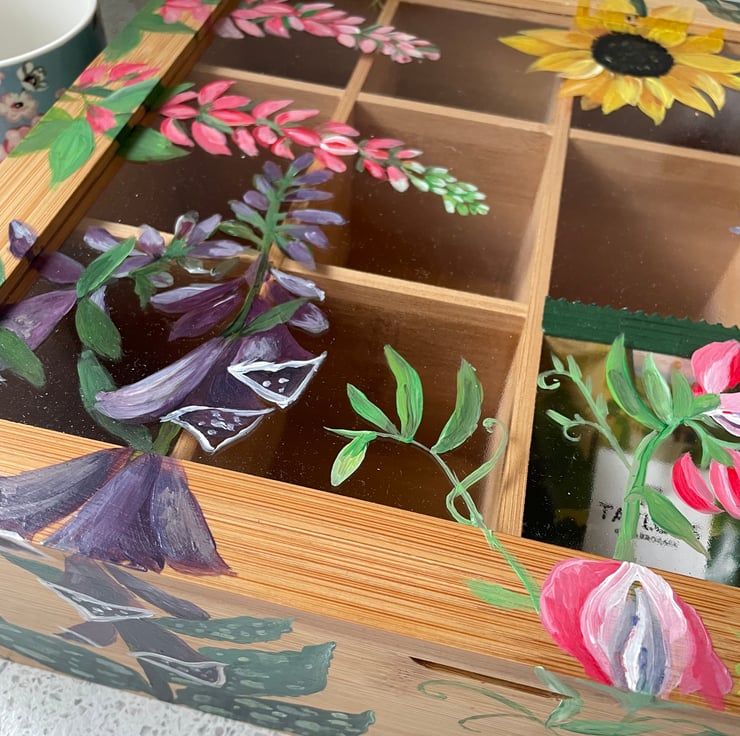 Is it hand painted with an array of flowers from delphiniums and foxglove to sunflowers and has a Perspex lid so you can see your tea collection, Flowers may vary so if you would like specific ones let me know
