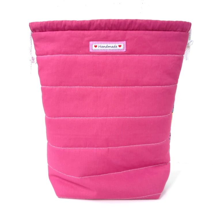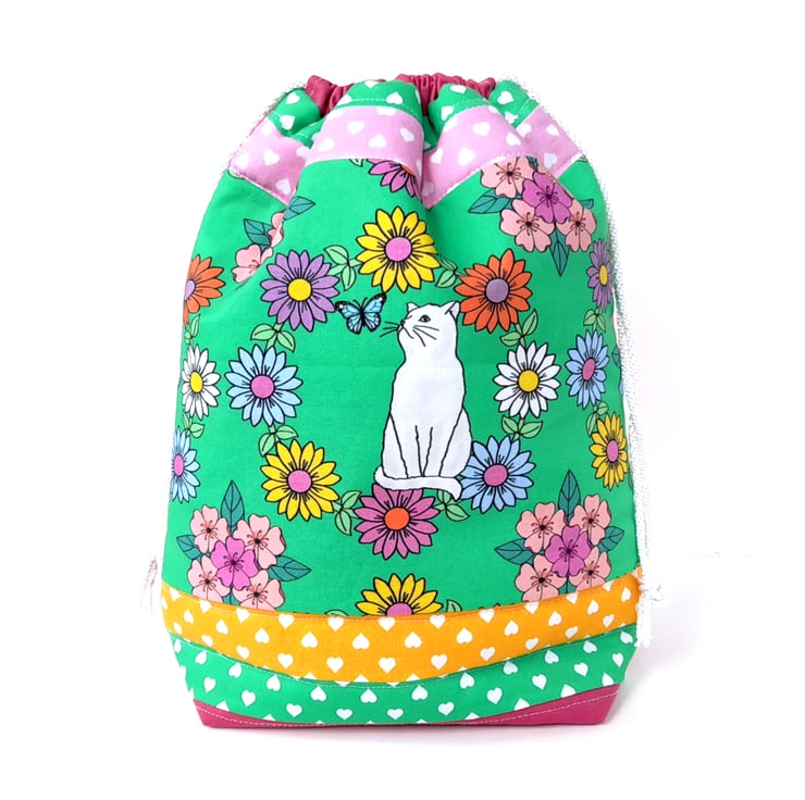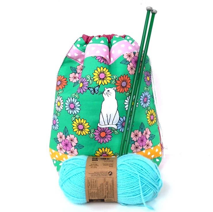 This is a lovely colourful patchwork drawstring project bag with a cute white cat looking at a butterfly on the front. It would make a useful gift for a cat lover who knits / crochets / enjoys needlework and crafts or treat for yourself. Could also be used as storage when travelling etc.