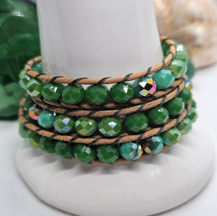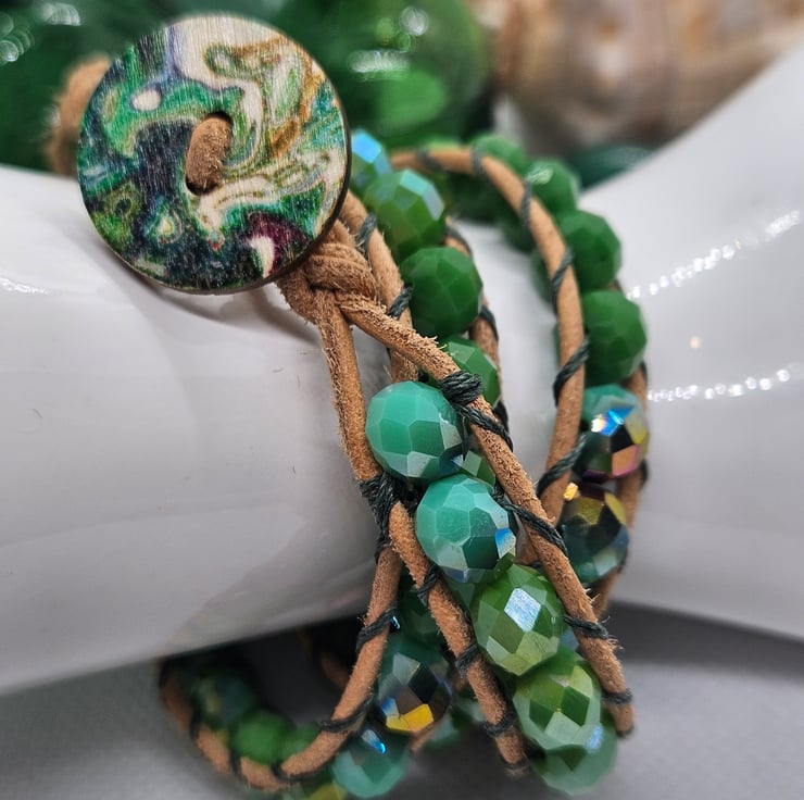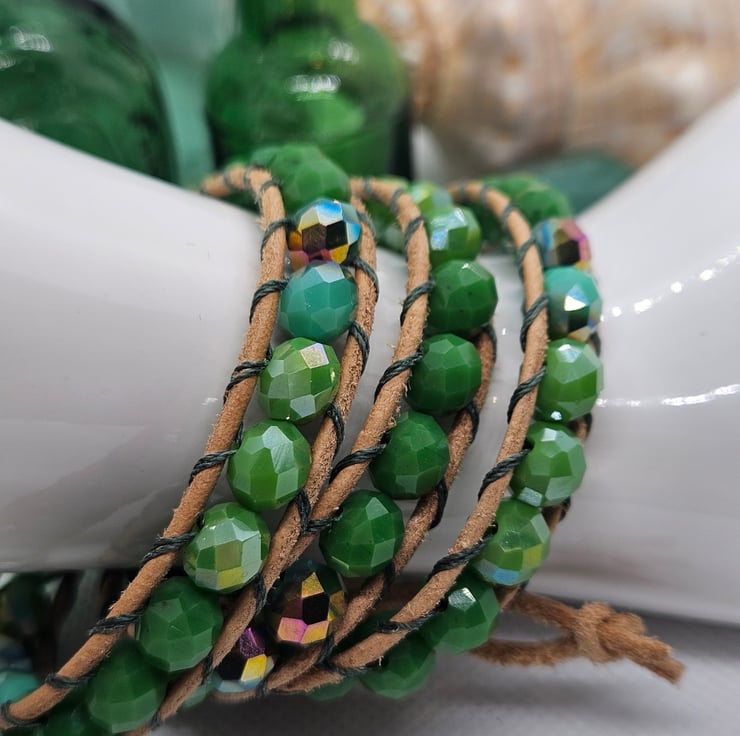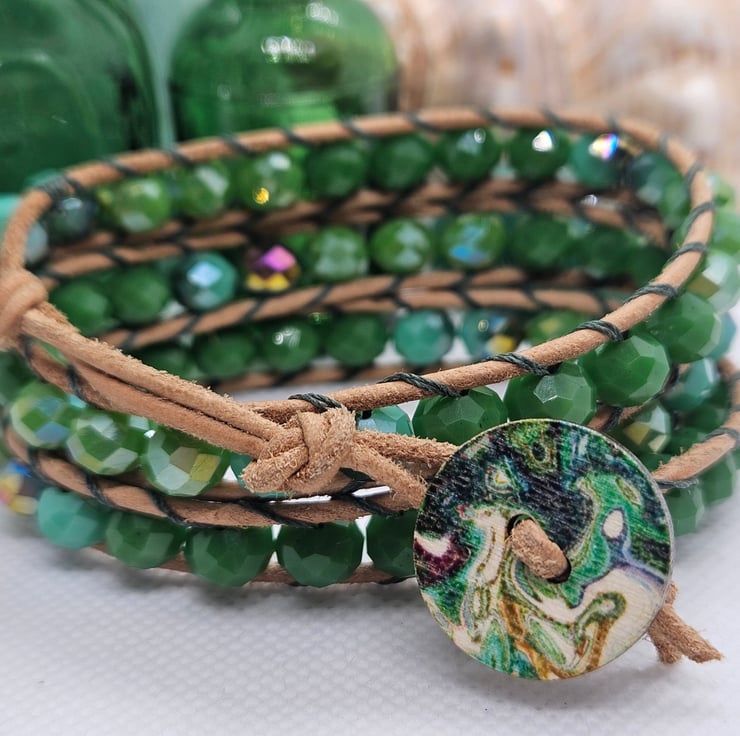 Beautiful triple wrap bracelet hand made with hues of green czech glass faceted beads sewn onto natural leather with green thread. A wooden green patterned closure gives a finishing touch. The colours are a gorgeous mix of opaque greens some with an AB shine. This bracelet is adjustable for two sizes. The length of the bracelet is 23". Before putting your bracelet on, take each end and give the length of the bracelet a gentle stretch to allow the beads to sit after storing. This will be gifted in a drawstring bag with free postage.