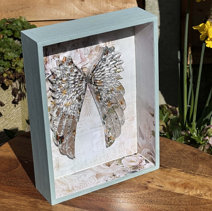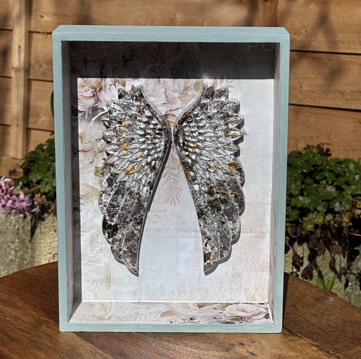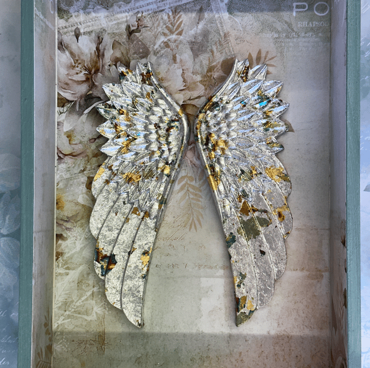 The wings rest within a deep box frame painted in soft sage green and lined with coordinating scrapbook papers.