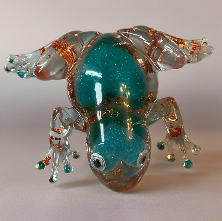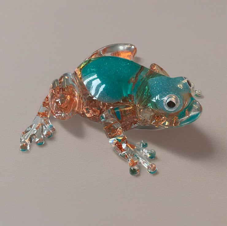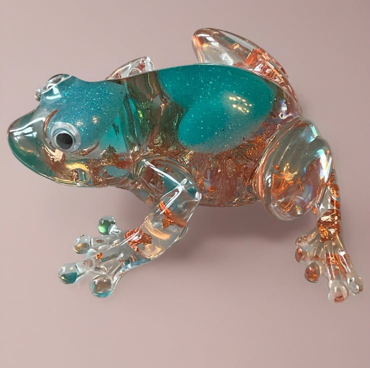 This charming handmade resin frog is full of character and sparkle. Carefully crafted by hand, the frog features a beautiful teal glitter heart set inside clear resin, surrounded by shimmering gold leaf flakes that catch the light from every angle.