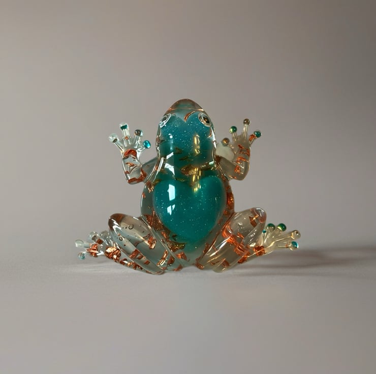 I was inspired by the beauty of frogs in nature and wanted to create something playful and magical. The glittering teal heart represents the spirit of the frog, while the floating gold leaf adds warmth and a sense of wonder inside the clear resin.
